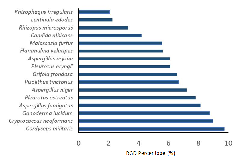 The arg-gly-asp (RGD) peptide sequence, which is found on animal-derived extracellular matrix (ECM) molecules such as fibronectin, mediates the adhesion of cells to the matrix. However, these ECM proteins are derived primarily as byproducts of animal agriculture, which is not sustainable, and risks microbial contamination. By datamining protein databases of fungi and plant species for the RGD sequence, it was surprisingly found that in 98% of these species, at least 1% of the reported proteins harbour RGD! While pathogenic fungi such as C. albicans often had a high RGD content, so did many edible mushroom species as enoki (F. velutipes), shiitake (L. edodes) and king oyster mushroom (P. eryngii).