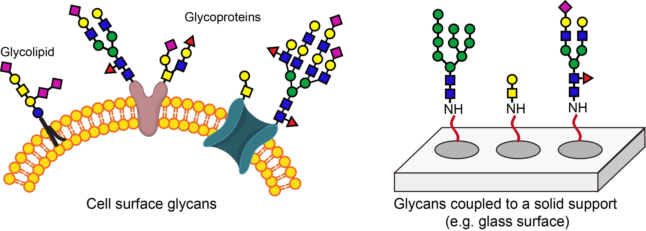 Today, most glycan microarrays, including the ones used by the Consortium for Functional Glycomics, are fabricated by coupling individual sugars synthesized chemically to N-hydroxysuccinimide ester functionalized glass slides. The construction of such microarrays is time-consuming and requires highly specialized experts. It is difficult for scientists who are interested in studying the biological functions of glycans to fabricate such microarrays in their own labs. In addition, glycans attached to a solid support do not fully recapitulate their natural arrangements on the cell surface.