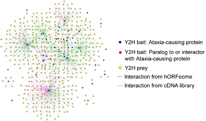 Figure 3: Generating a proteome-scale interactome network for inherited ataxia with gateway-compatible yeast two-hybrid (Y2H) destination vectors, to generate fusion proteins of ataxia constructs to analyze the neurological disorder. Credit: [Lim 2006].