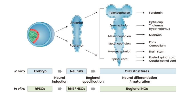 The stages of neural organoid generation contain 3-4 steps that mimic the first principles of in vivo developmental cascades. Bioengineers typically induce human pluripotent stem cells into neuroepithelia-like cell populations by applying culture factors/components to determine neural fates. The process can result in the induction of anterior and posterior neural parts via diverse developmental processes, followed by further specification of 3-D neural clusters into specific domains [Lee 2022]. These neural organoids can be cultured under appropriate conditions for neural differentiation, advanced neural development, and long-term maturation steps, as suited for cell bioengineering experiments.