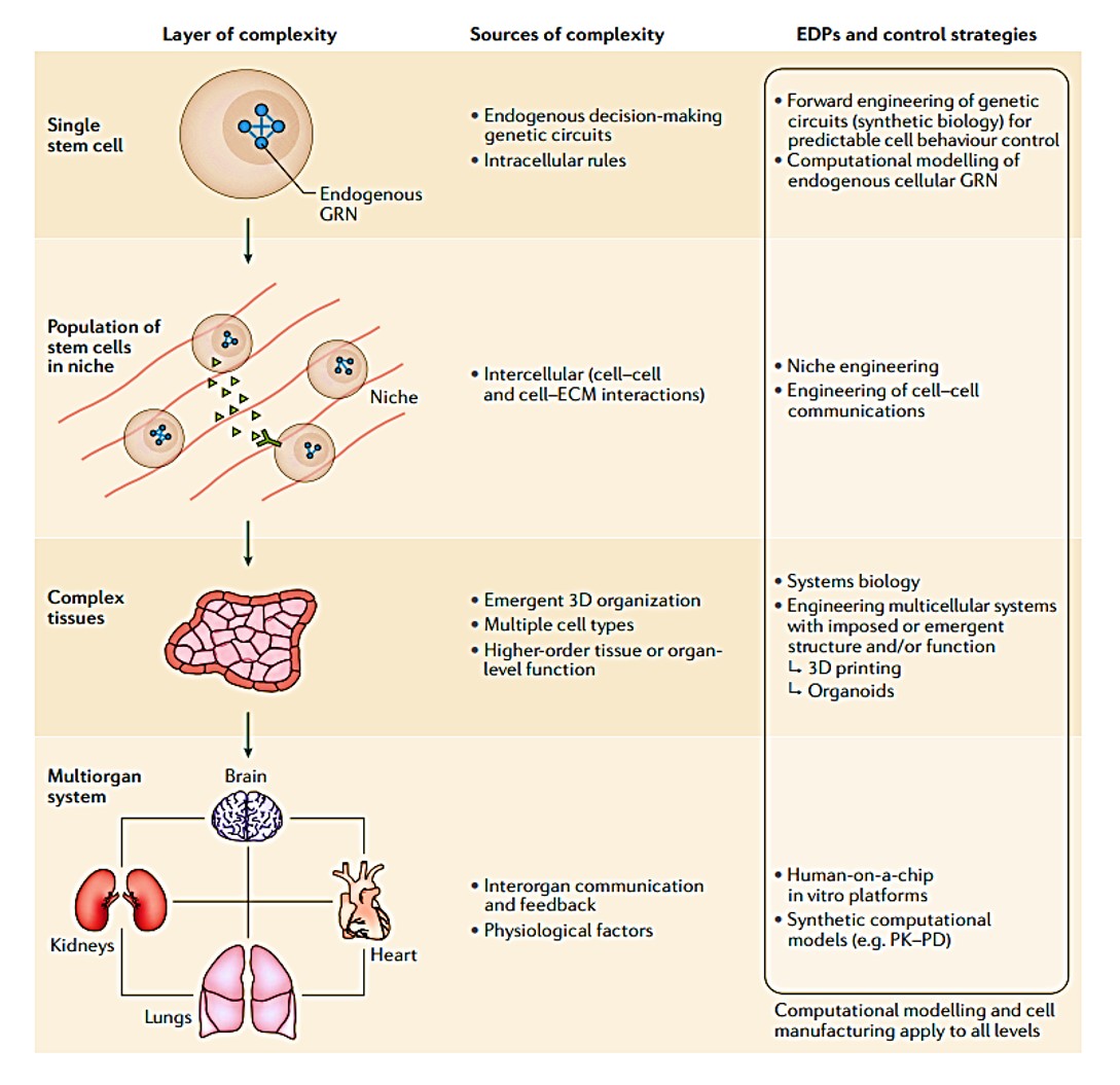 Figure 1: layers of complexity in stem cell inclusive cell bioengineering systems. Credit: [Tewary 2018].