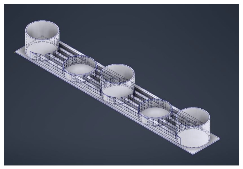 Figure 6: Designing a microfluidic device with five wells. The deeper wells serve as media reservoirs and the shallower regions house the organoids, with interconnecting channels to exchange nutrients and waste, while limiting shear stress for optimized brain organoid growth. Credit: [Hetzel 2023].