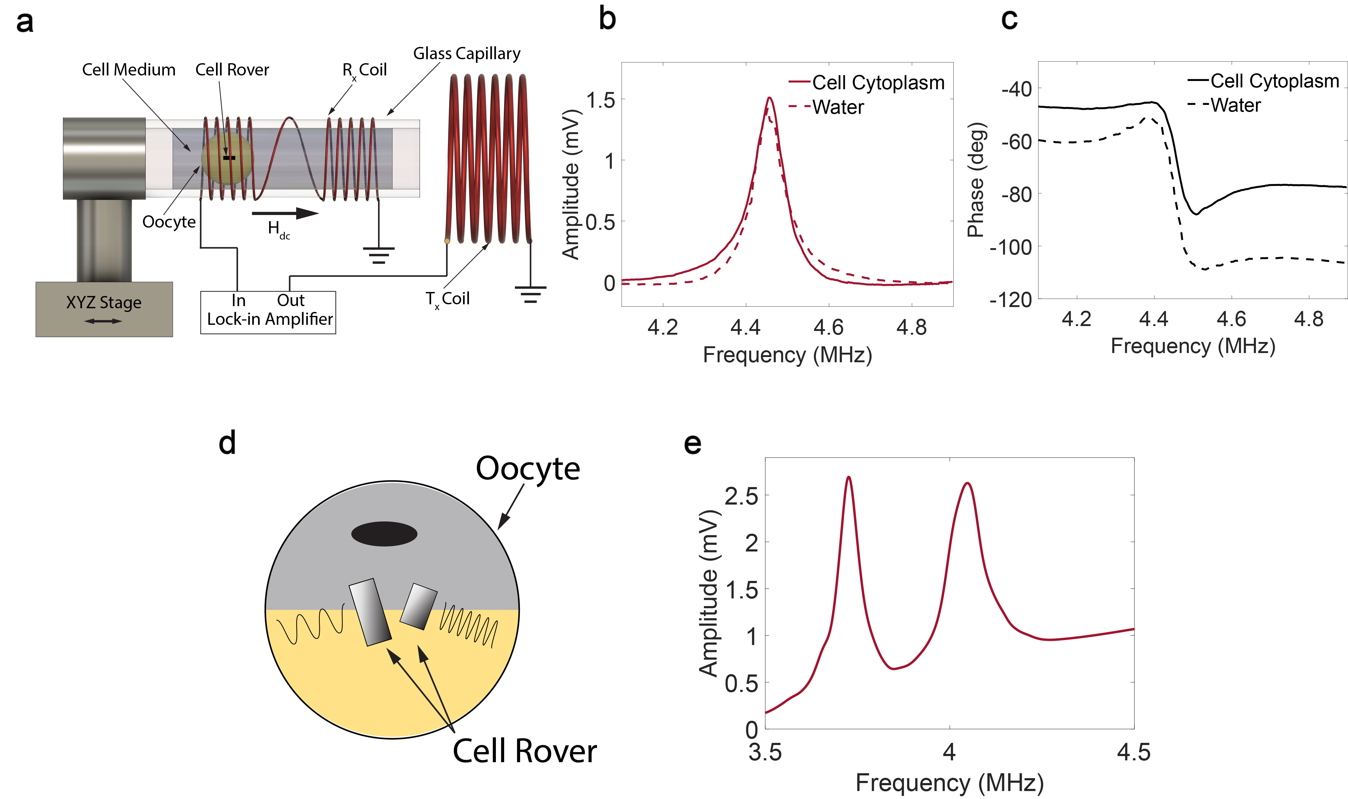 Fig. 3. a Schematic diagram of the setup for wireless detection of Cell Rovers and the detected b amplitude and c phase as a function of frequency for operation in cell cytoplasm and water. d Schematic diagram showing multiple resonators injected in the same Xenopus oocyte and the detected e signal amplitude as a function of frequency.
