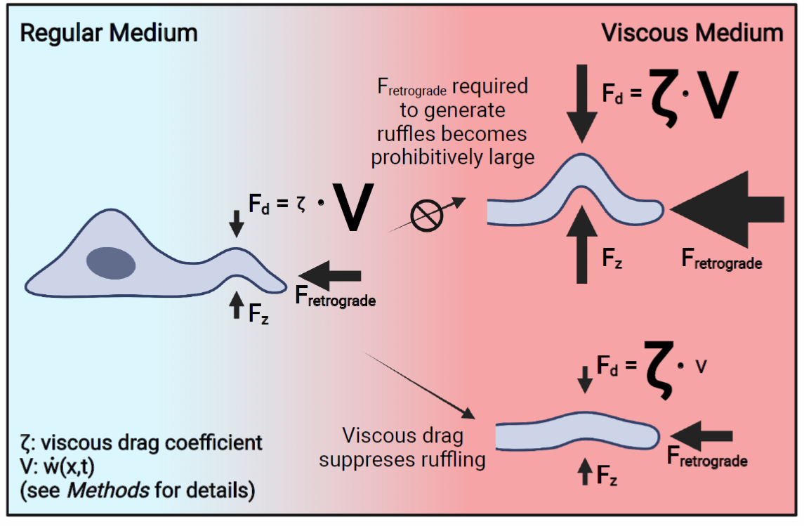 After many tests, we concluded the counter-intuitive speed increase that surprised us is due to viscous drag. The extremely high viscous drag prevents the plasma membrane from ruffling up and down as in regular medium, thereby redistributing the membrane originally stored in the ruffles, resulting in a 2-fold increase of spread area, formation of more focal adhesions which facilitate faster cell migration.