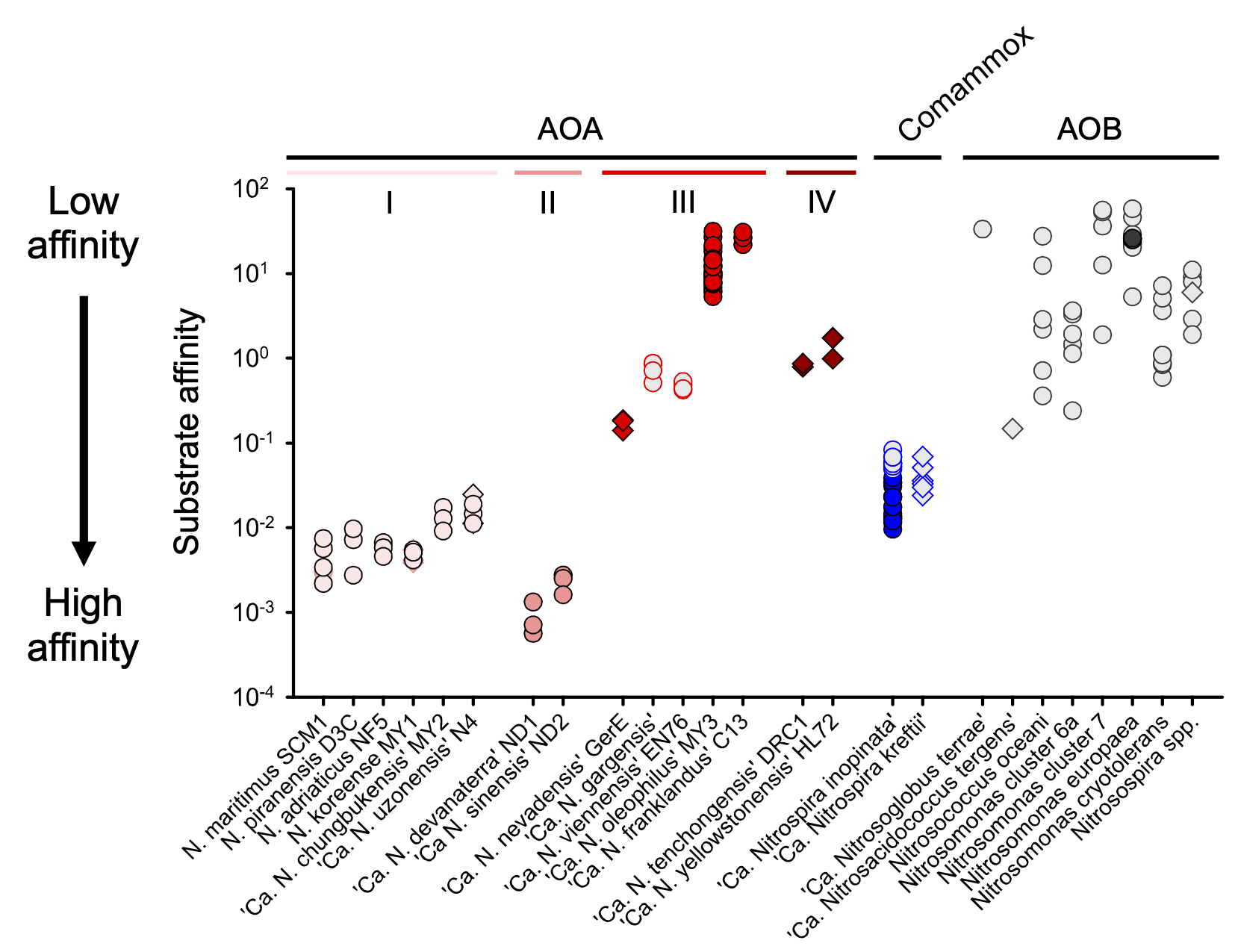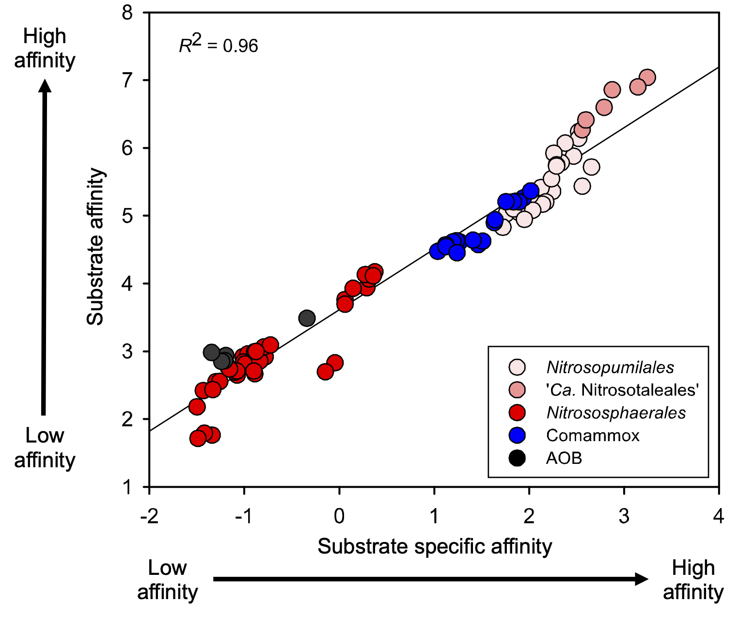 Figure 2. Here you can see that the ‘Ca. Nitrosotaleales’ AOA found in the top right of the graph are the best competitors for NH3, having both a high substrate affinity (Km) and a high substrate specific affinity (ao). In comparison, the Nitrososphaerales AOA and the AOB are among the worst competitors for NH3.