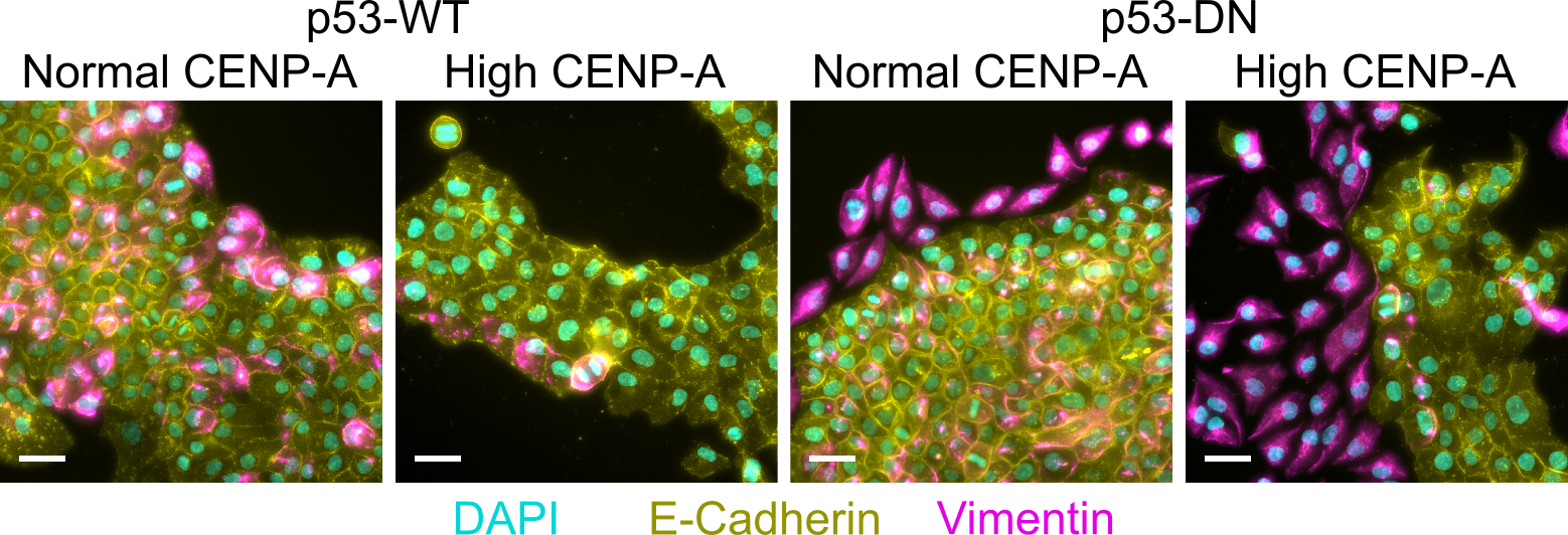 Our next step was to explore the impact of CENP-A overexpression—and its interplay with p53—at the single-cell level, over time, as the population evolves. Essentially, we had the capacity to take snapshots of evolution in a dish, in response to this one stimulus, CENP-A overexpression. We were working with cells all derived from the same clone, so the only difference between conditions, other than CENP-A levels, was the presence or absence of the p53-DN peptide. With this near identical starting point, we induced CENP-A overexpression and passed the cells for weeks and weeks, always refreshing the Doxycycline (the drug we use to induce CENP-A overexpression) to maintain them in their steady overexpressing state for over 60 generations. Finally, we did single-cell RNA-seq. This allowed us to look at the differences in expression profiles across thousands of individual cells for each condition. We could see how they had diverged over time and assess the impact of CENP-A overexpression and change of p53 status on their cell state and identity. One of the most remarkable things we saw was the emergence of a small but distinct population of mesenchymal-like cells in the condition with both chronic CENP-A overexpression and defective p53. When epithelial cells change to mesenchymal cells, they lose their strong cell-to-cell contacts and increase mobility, important for cell migration during development but just as important for tumour cell invasion and metastasis! It was well established that functional p53 can help to prevent this transition16–21 but the idea that CENP-A overexpression might promote this change was something we had not even thought to look for. Seeing this emergent population in the single-cell data prompted us to go back and look at our cells under a new light (or, more precisely, under an epifluorescence microscope) to see if we could detect epithelial-mesenchymal transition by eye (E-cadherin as a marker for epithelial cells; Vimentin as a marker for mesenchymal). And it was like they should have been staring us in the face the whole time! A major population of mesenchymal-like cells was emerging in the p53-DN cells after just a few weeks of CENP-A overexpression—looking distinctly sinister with their horned vimentin halos! You can see what I mean below!