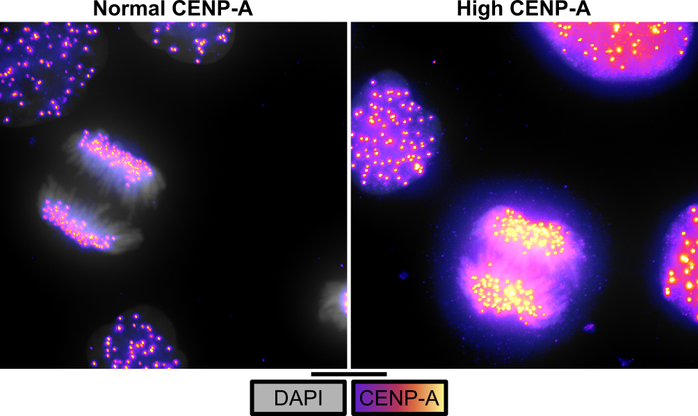Why did we overexpress CENP-A? Besides seeing the beauty of cells undergoing mitosis, we wanted to increase CENP-A in these cells to mimic what happens in certain types of cancers. Indeed, CENP-A is aberrantly overexpressed in a wide range of cancers (relative to normal tissues)5,6, and, strikingly, these tumours with higher CENP-A levels tend to be more aggressive (e.g., higher grade, more invasive, earlier relapse)5–13 than tumours with less CENP-A. Curiously, previous reports indicated a correlation between high CENP-A levels and improved therapeutic response6,13, while others have reported the opposite7. Thus, we questioned the link between CENP-A, tumour aggressiveness and therapeutic response. Does CENP-A overexpression in a given cell give it a competitive advantage in cancer evolution? How could high CENP-A promote sensitivity to cancer therapies in some cohorts and resistance in others? To try to answer these questions, we established a system where we could change, at will, CENP-A expression in a tuneable fashion—so that’s what you see in the images above.