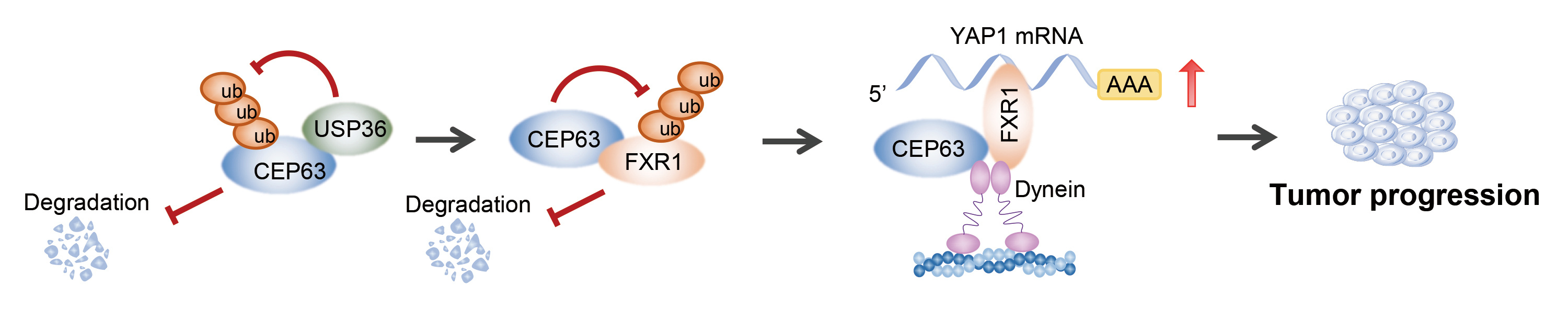Next, we wondered the underlying mechanism of CEP63 affecting the biological phenotype of CRC cells. Through transcriptome sequencing and verification, we identified that CEP63 promoted CRC stem cell-like phenotype by enhancing YAP1 expression. Subsequently, we revealed that CEP63 could bind multiple RNA binding protein (RBP) through IP-MS analysis and confirmed that one of the RBPs, FXR1, could mediate the regulation of CEP63 on the stability of YAP1 mRNA. Furthermore, we confirmed that CEP63 stabilized FXR1 protein by binding with the KH domain of FXR1 and inhibiting its K63-dependent ubiquitination degradation. In addition, we found that both CEP63 and FXR1 could interact with dynein components, which was, at least partly, mediated in CEP63/FXR1/YAP1 pathway. Considering CEP63 binding with multiple other RBPs, the data suggested that CEP63 exerted function as a common partner of RBP to regulate the destiny of RNA. Therefore, we here proposed CEP63/RBPs/RNA axis and identified novel molecular function of CEP63. But the precise mechanism needed further investigation.