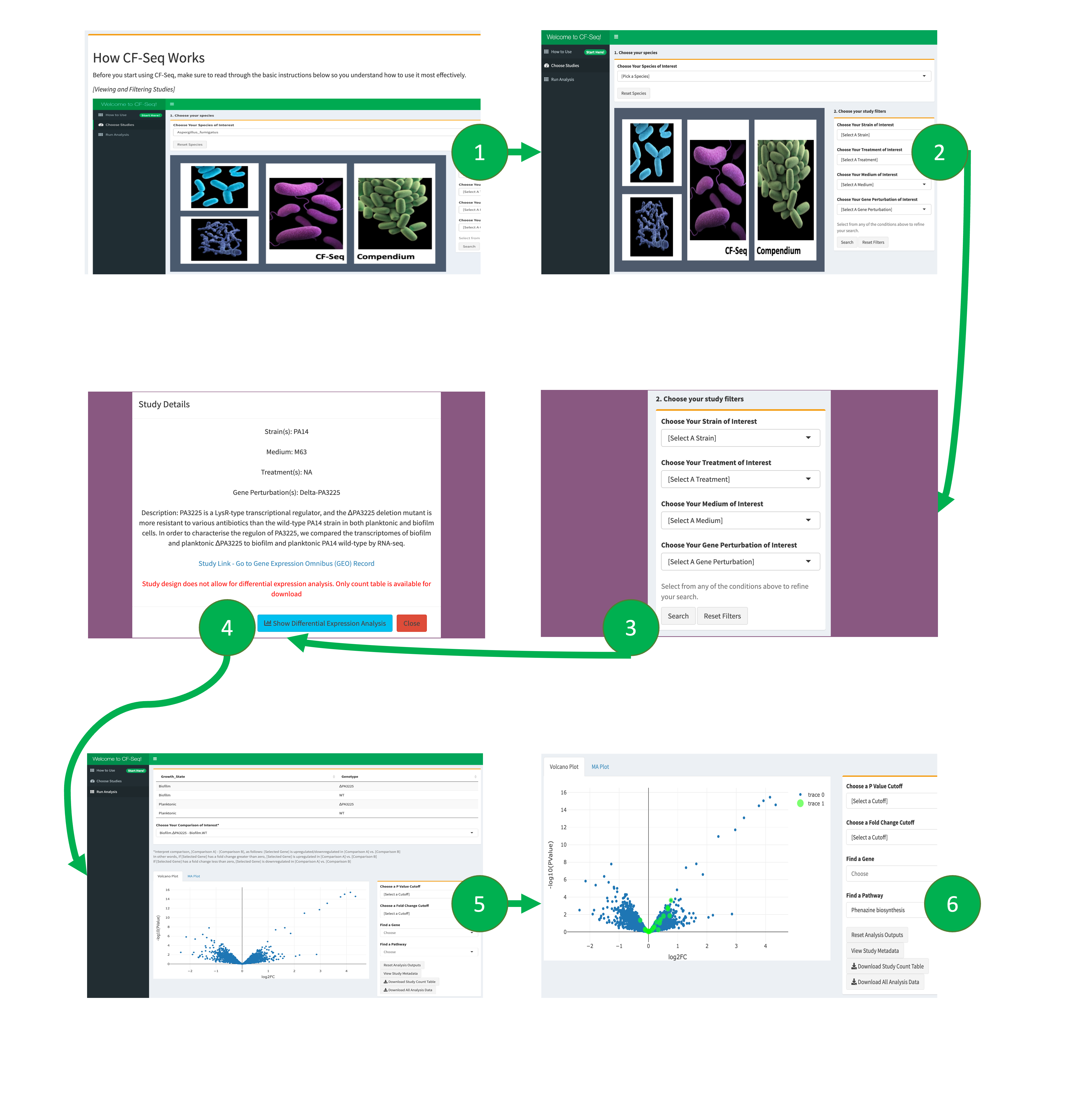 Application workflow for CF-Seq users. Panel 1 shows the starting window of the application, where users are presented with a manual that explains the functionality and purpose of the application. Users are then directed to the study view screen, shown in panel 2, where they can select a species of interest and view available RNA-Seq studies. Panel 3 shows how filters can be applied to delineate studies with certain experimental characteristics (strain, media, treatment, gene perturbed). Panel 4 offers a look at the metadata that can be examined for each individual study. Panels 5 and 6 show the study analysis window, where analysis tables and figures can be generated for all experimental comparisons, individual genes may be highlighted, P value and fold change cutoffs can be selected, and differentially expressed genes on selected KEGG pathways can be highlighted when KEGG pathway information is available (Panel 6). For certain studies, users can also highlight other biological features, such as GO terms, COG categories, and functional descriptions of genes (e.g., “serine/threonine protein kinase”). Zoomed in versions of these figures are available in the supplementary information of our associated publication1.