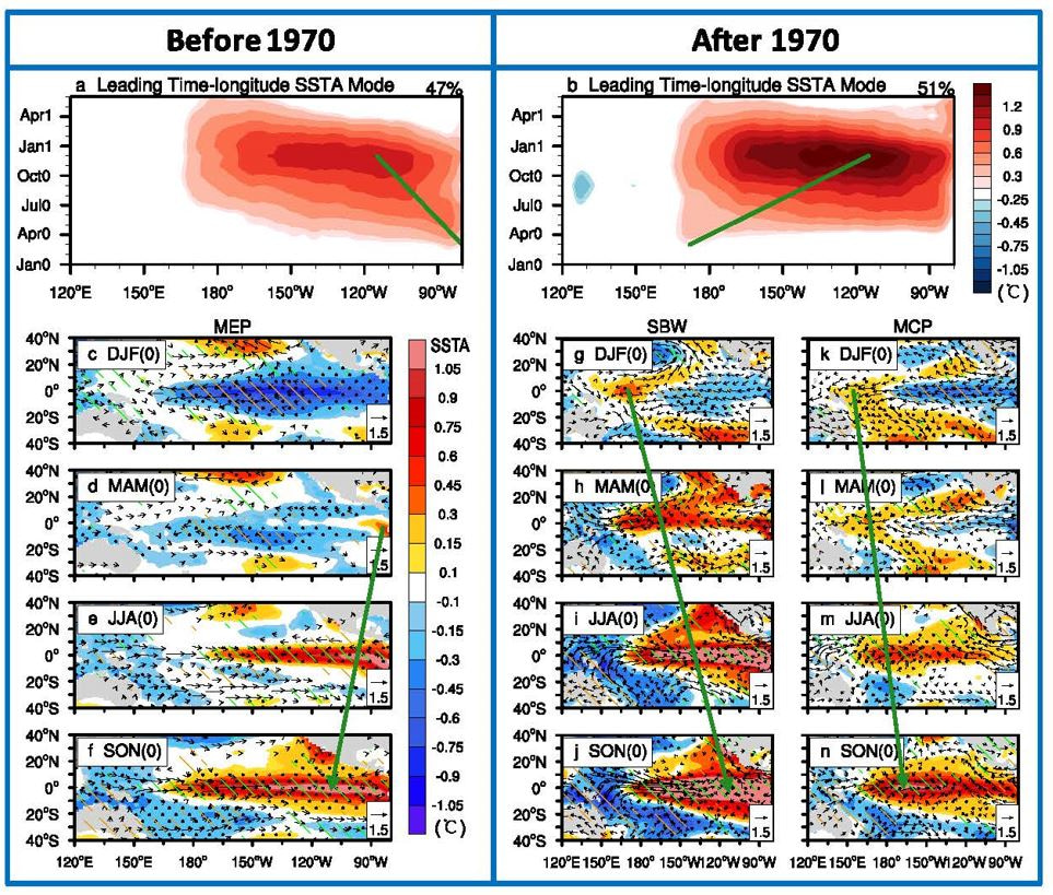 An Extended Empirical Orthogonal Function (EEOF) analysis of sea surface temperature anomaly (SSTA) with a 41-year moving window shows a marked interdecadal shift of El Niño onset location around 1970, that is, El Niño started its warming in eastern Pacific (EP) before 1970 but in western Pacific (WP) after 1970. Accompanied to the distinctive onset location shift are opposite zonal propagation directions of the maximum SSTA center (Fig. 1a-b). This characteristic is consistent with the occurrence of a moderate eastern Pacific (MEP) onset type prior to 1970 but a strong basin-wide warming (SBW) and a moderate central Pacific (MCP) type after 1970 (Wang et al. 2019), as seen in Fig. 1c-n.