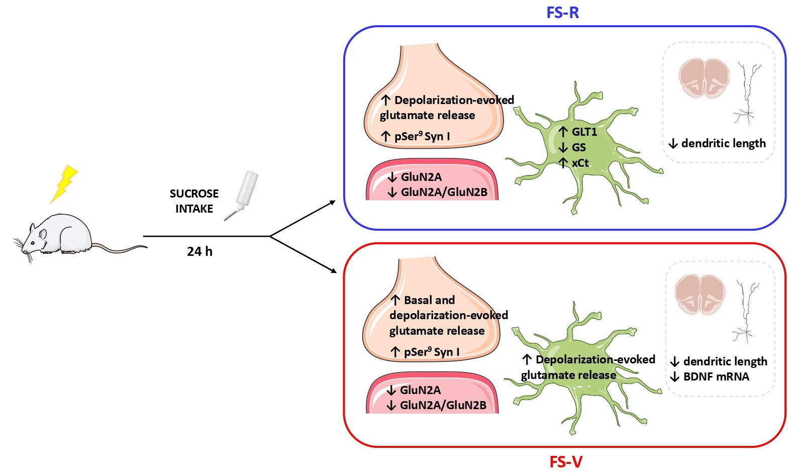 In the present work, we introduce a new rodent stress model based on acute inescapable FS stress, where male rats were deemed resilient/vulnerable based on their behavior in the sucrose intake test for anhedonia, performed 24 h after acute stress. This approach allowed us to identify early functional, molecular, and morphological determinants of stress resilience/vulnerability at tripartite glutamate synapses in the prefrontal cortex (PFC). Our study has recently been published in Translational Psychiatry with the title: “Changes at glutamate tripartite synapses in the prefrontal cortex of a new animal model of resilience/vulnerability to acute stress”.