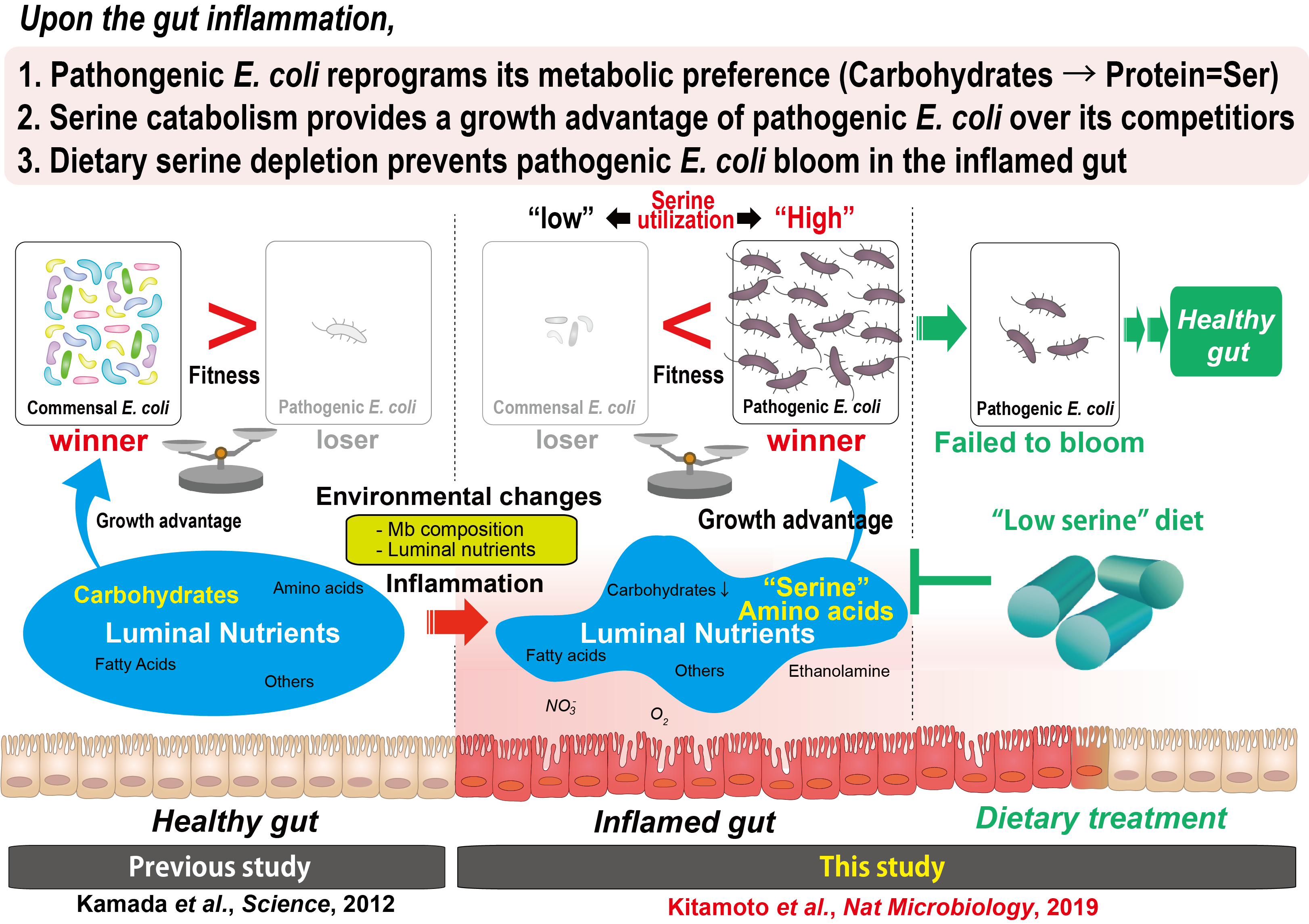 Sho Kitamoto, Christopher J. Alteri, Michael Rodrigues, Hiroko Nagao-Kitamoto, Kohei Sugihara, Stephanie D. Himpsl, Malak Bazzi, Mao Miyoshi, Tatsuki Nishioka, Atsushi Hayashi, Tina L. Morhardt, Peter Kuffa, Helmut Grasberger, Mohamad El-Zaatari, Shrinivas Bishu, Chiharu Ishii, Akiyoshi Hirayama, Kathryn A. Eaton, Belgin Dogan, Kenneth W. Simpson, Naohiro Inohara, Harry L. T. Mobley, John Y. Kao, Shinji Fukuda, Nicolas Barnich & Nobuhiko Kamada. Dietary L-serine confers a competitive fitness advantage to Enterobacteriaceae in the inflamed gut. Nature Microbiology, epub Nov 2019