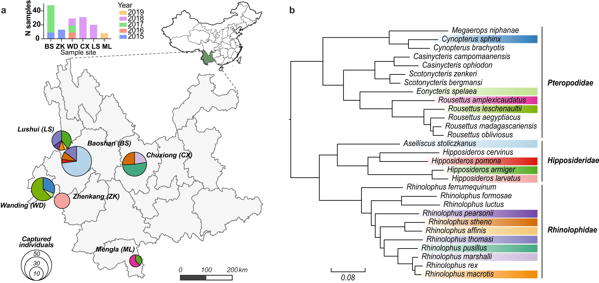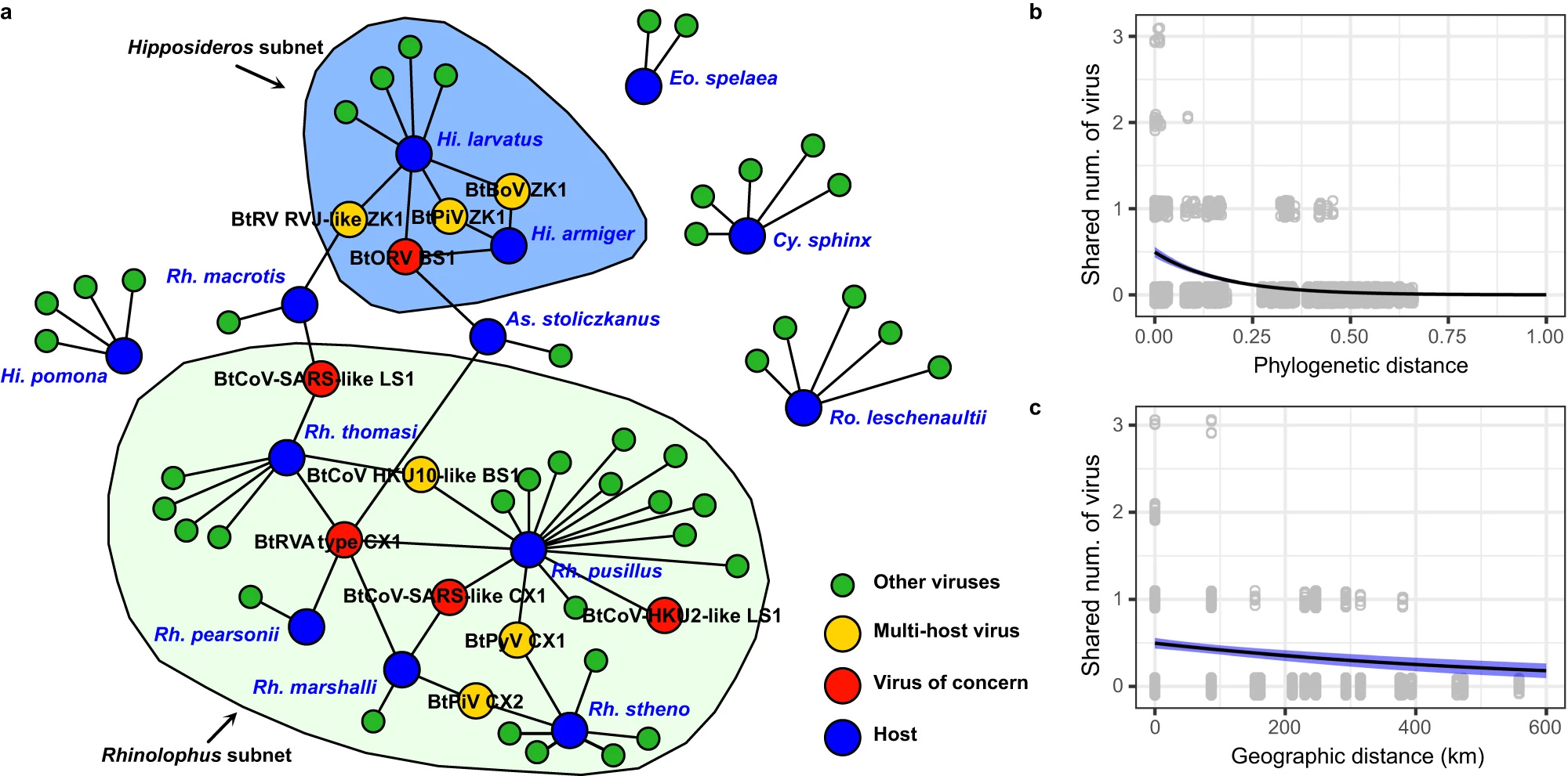 In the present study, we collected rectum samples from 149 bats in Yunnan province, China, between 2015 and 2019 for meta-transcriptomic analysis (Fig. 1). Our results revealed a high level of viral diversity within bat individuals. A total of 55 bat-associated virus species were identified, of which 42 virus species were likely to be novel viral species. We found a high frequency of virus co-infection (Fig. 2) and cross-species transmission (Fig. 3) among bat individuals. Such high frequency of co-infection and cross-species tranmission can potentially increases the opportunities for viral recombination and reassortment, and thereby enriching the genetic diversity of viruses circulating in populations of wild animals. We also observed that the transmission of viruses between bat individuals is strongly constrained by both host phylogenetic distance and spatial distance. In other words, the further the genetic relationship between hosts and the less overlap in their territories, the less likely viral transmission is to occur (Fig. 3).