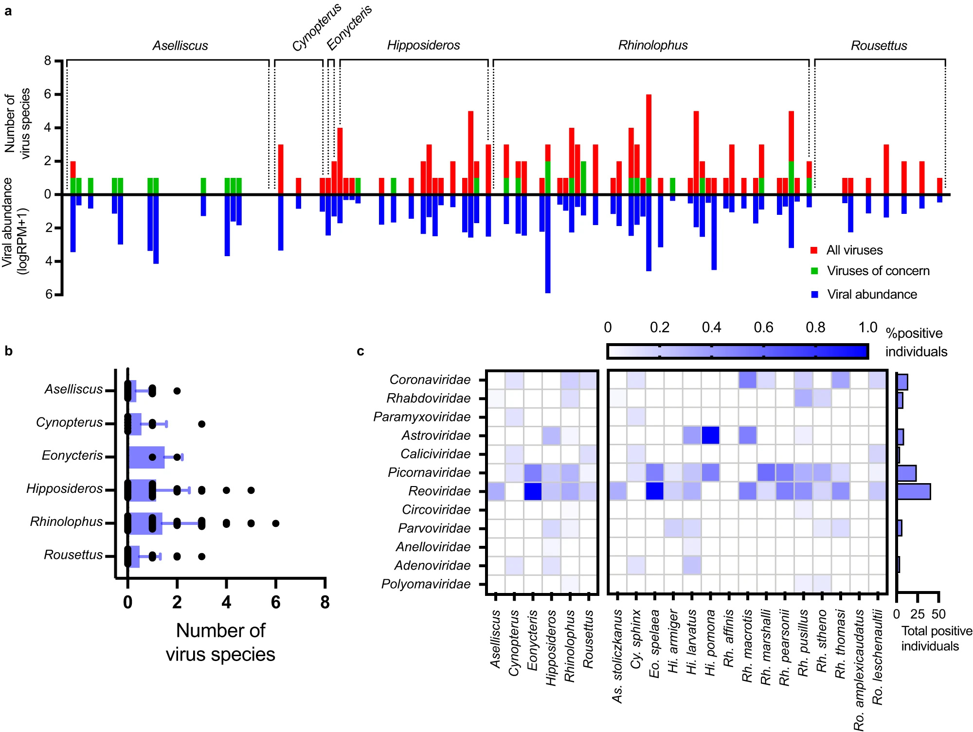 In conclusion, using an individual virome approach we revealed a high frequency of virus co-infection and inter-species transmission among bats. The discovery of a diverse array of bat-associated viruses, including those potentially pathogenic to humans and livestock, emphasizes the need for continued vigilance in monitoring bat populations as potential sources of emerging infectious diseases. The identification of a novel recombinant Sarbecovirus that can utilize the human ACE2 receptor raises concerns about the potential for future zoonotic spillover events. Further research into the diversity and abundance of viruses within bats is necessary to better understand the risks associated with zoonotic transmission and to inform the development of strategies for disease prevention and control.