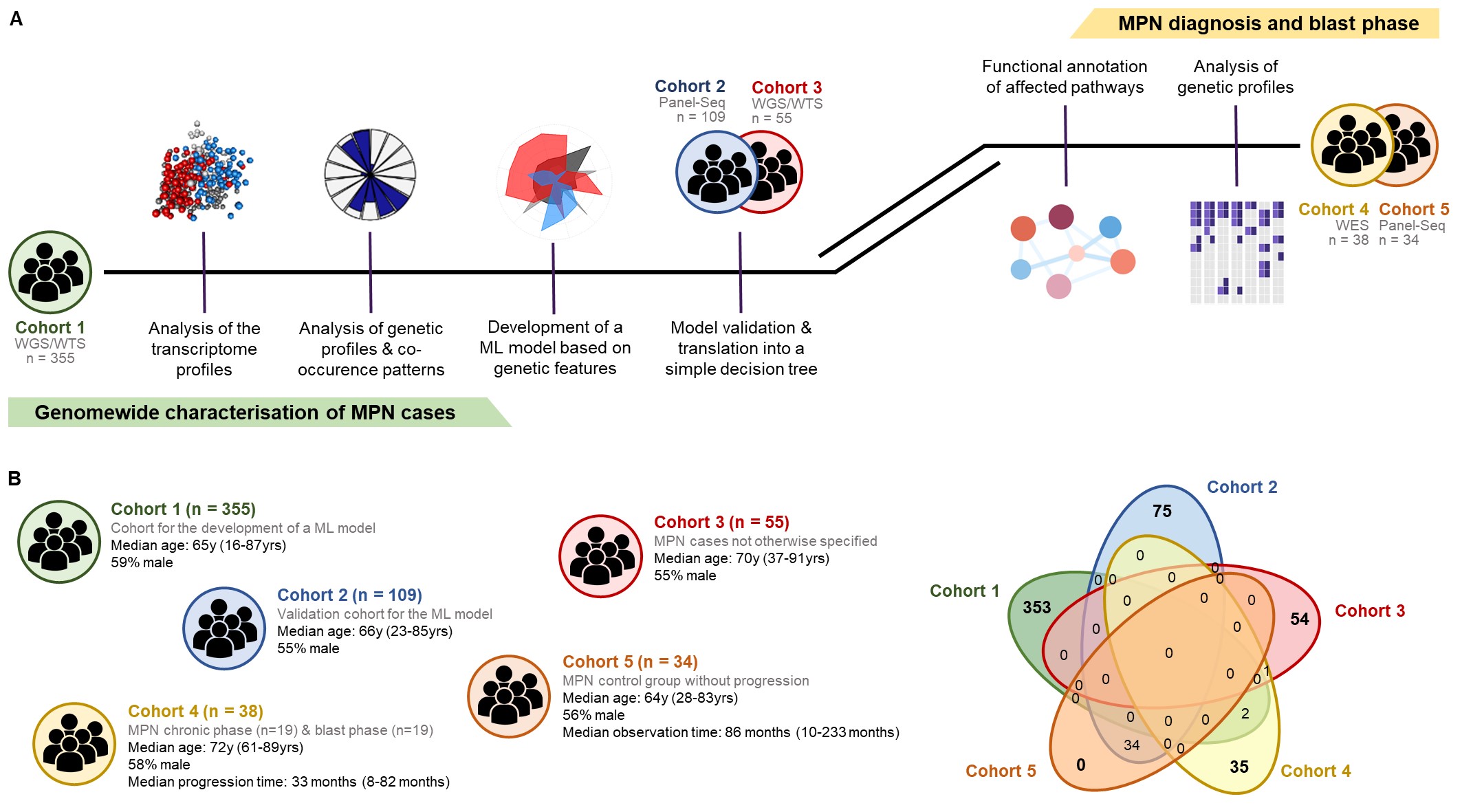 The study entailed comprehensive analyses across various cohorts, starting with a genome-wide characterization of MPN cases by whole genome transcriptome analysis. This analysis paved the way for the subsequent generation and validation of a machine learning model based on genetic features. This model was further distilled into a streamlined decision tree for routine clinical application (refer to Figure 1A, left). Additionally, the research included an examination of whole exome data for MPN cases that progressed to the blast phase, enriching our understanding of disease evolution (see Figure 1A, right). Figure 1B provides an overview and succinct description of the analyzed cohorts on the left, while a Venn diagram on the right illustrates the overlap of patients among the different cohorts.
