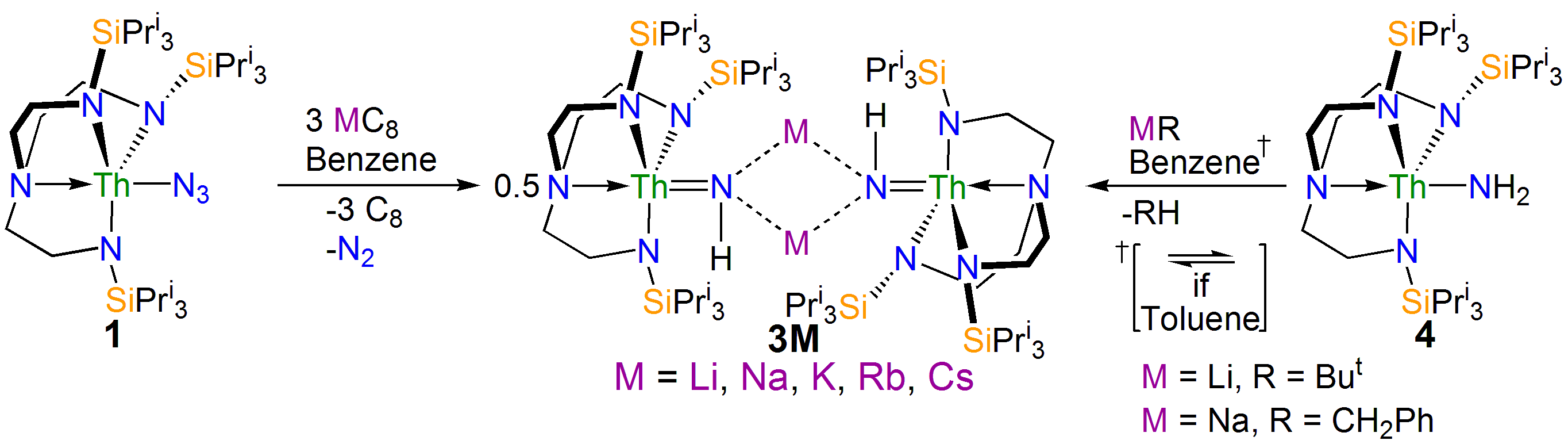 Interestingly, if the trapping agent to make the heterocycle is not added the reduction of 1 eventually results in isolation of parent imido complexes 3M as shown in the scheme above, where the imido nitrogen is derived from a transient nitride and the imido hydrogen is picked up from solvent. Furthermore, the parent imido dimers 3M can be accessed from the parent amide 4, but only cleanly in benzene; when toluene is used an equilibrium is established showing that these parent imidos can deprotonate toluene. This was in a sense frustrating, but in collaboration with Laurent Maron at the University of Toulouse we were able to computationally model the reaction profiles, and they clearly show the formation of reactive nitrides that are able to deprotonate benzene and toluene solvents to make the observed imido complexes, but the less basic imidos can only deprotonate toluene. This is gratifyingly entirely consistent with out experimental observations.