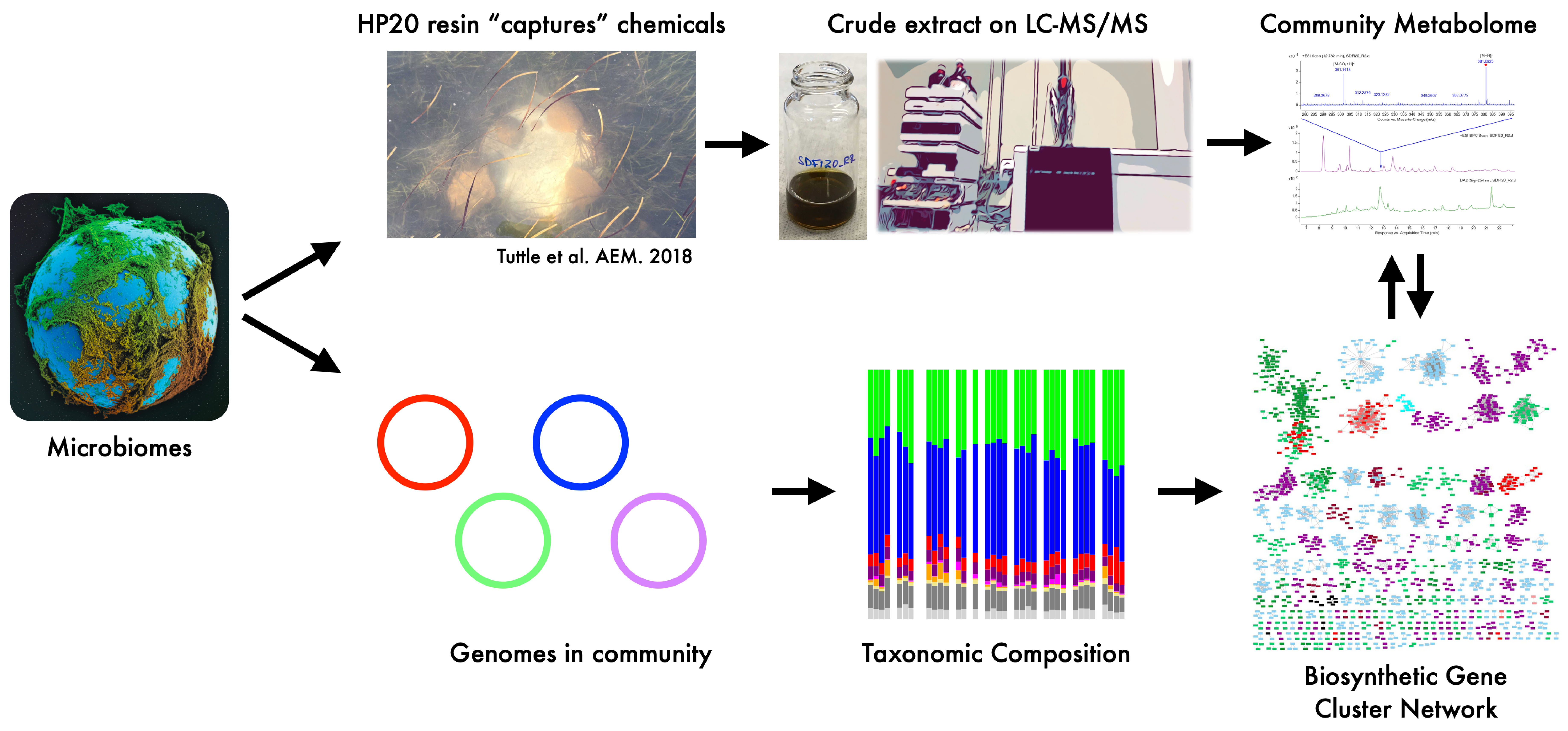 In these marine environments, chemistry is the language of choice for microbes. All organisms, including microbes, produce chemical compounds to interact with the environment. These may be for internal signaling, environmental responses, resource acquisition, or for antagonistic interactions like antibiotic production. In microbiomes, these metabolites perform a variety of ecological roles, with many mediating species interactions. Thus, they are classified as biotic filtering in classical ecological theory. However, we know little about the production of these metabolites in natural communities, their concentrations in natural systems, or even the roles most of these molecules perform in mediating interspecies relationships within these complex communities. This is due in part to the focus on these specialized metabolites for pharmaceutical exploitation, with most of the current drugs derived directly from these natural products.