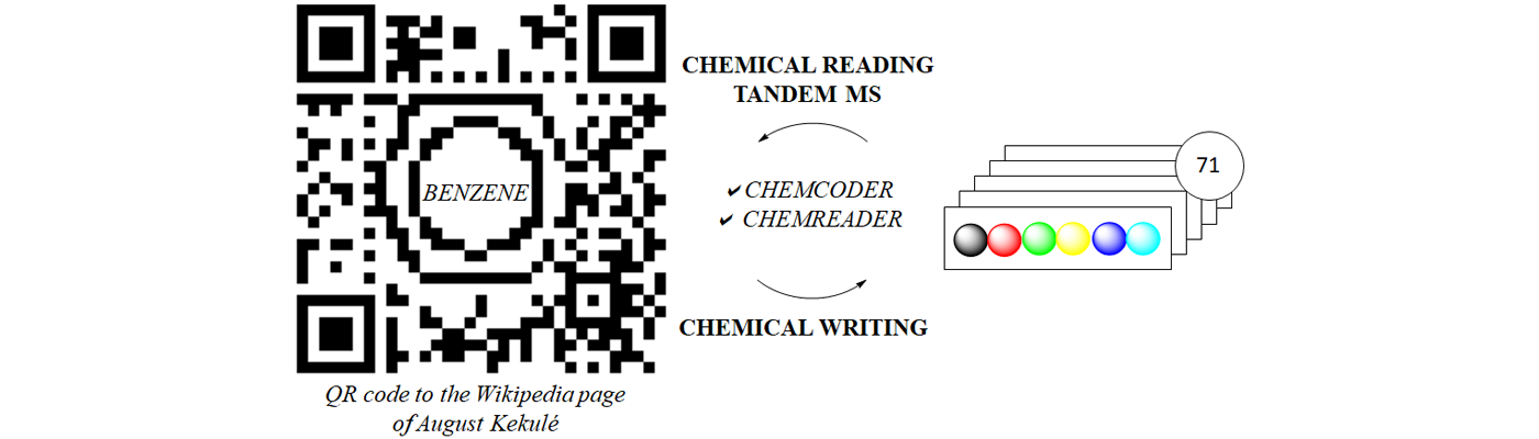 When I joined Professor Filip Du Prez’ research group five years ago and started my own research on precision polymers, making use of sequence-defined chemistry, I never imagined becoming part of an interdisciplinary research project for which I’d have to store sentences and QR codes on molecules, nor did I suspect I’d be working together with the biochemistry and informatics departments of Ghent University. The success of this interdisciplinary research not only depended on the skills of my own research group, headed by Professor Du Prez, but also on the expertise of his colleagues Bart Devreese and Peter Dawyndt. I spent the first years of my PhD optimizing and automating the sequence-defined protocol and expanding the monomer alphabet. As soon as this was done, we were able to write the different oligomers containing the words of the sentence or pieces of a QR code. Professor Devreese contributed by helping us out with both his expertise in mass spectrometry and his MALDI-MS/MS equipment, which allowed for the easy read-out of the information encoded on the oligomers. As the analysis of the mass data obtained is very time-consuming, Professor Peter Dawyndt, expert in bio-informatics, created an algorithm which made it possible to reduce the analysis time to only a few seconds and to automatically process this data (Chemreader). A second algorithm (Chemcoder) was developed to help me translate a QR code which leads to the Wikipedia page of August Kekulé to a series of 71 different sequence-defined macromolecules and vice versa.