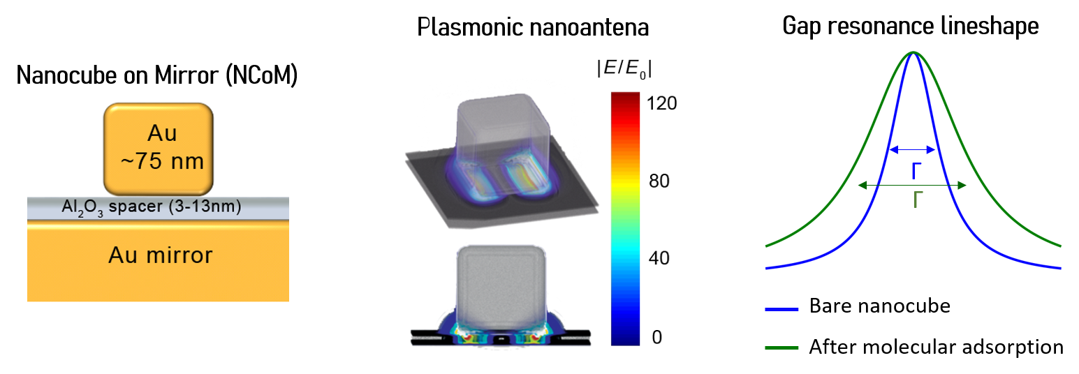 After a lot of brainstorming with Erik, other group members and Dr. Andrea Baldi, we converged into the exceptional nanocube on mirror configuration (NCoM). This construct gives rise to a so-called gap plasmon with resonance energies that are easily modified through changes to the dimensions of the nanoscale gap between the nanocube and the mirror. It also offers extreme light confinement and sharp resonances. These features offer the possibility to study single particles and small populations of molecules with highly sensitive spectroscopies such as surface-enhanced Raman scattering (SERS). More importantly, with single-particle measurements we were able to use the plasmon resonance’s lineshape properties - its energy, intensity and homogenous linewidth as extremely sensitive probes to monitor interfacial energy transfer and changes to the NCoMs chemical environment.