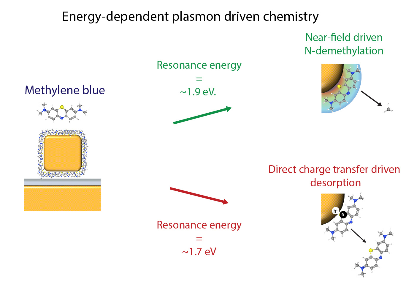 Figure 2: Energy-dependent plasmonic chemistry. Nanocavities that resonate at ~1.9 eV induce a near field-driven N-demethylation cleavage reaction, while nanocavities that resonate at ~1.7 eV induce a direct transfer-driven desorption.