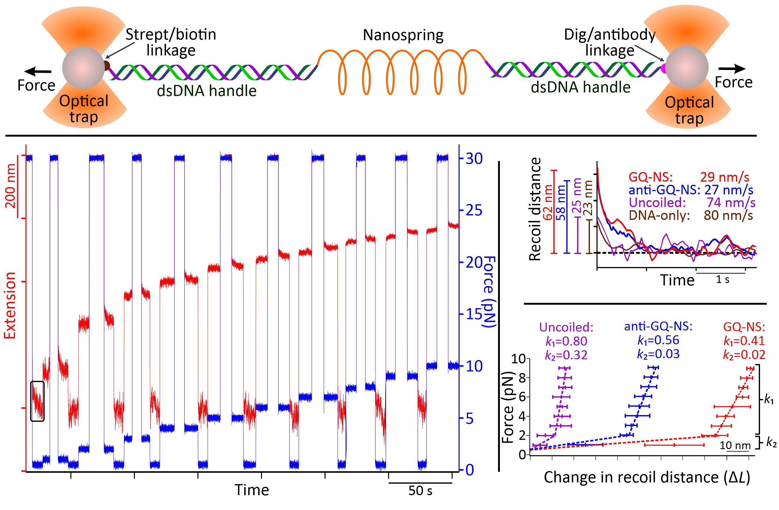 Through AFM image analysis, spirally coiled structures of nanosprings were observed in the presence of K+ or after incubation with anti-GQ DNA owing to the cumulative effect of the bending origami modules, while the origami without K+ or anti-GQ DNA showed a relaxed linear structure. Compared with the K+-induced nanospring (GQ-NS), the anti-GQ-DNA-incorporated nanospring (anti-GQ-NS) took a more coiled and compact structure as reflected in the statistical analyses of the AFM images. Measured values of the radius of the curvature and number of turns for anti-GQ-NS were 25.8 ± 2.8 nm (mean ± SD) and 3.5 ± 0.4, respectively, whereas those for GQ-NS were 43.9 ± 10.3 nm and 1.7 ± 0.4 nm. Using optical tweezers, we characterized the mechanical properties: the coiled length of GQ-NS was 189 ± 9 nm while that of anti-GQ-NS was 138 ± 3 nm. Likewise, the pitch length in 3D space was computed to be 110 ± 30 nm for GQ-NS and 39 ± 5 nm for anti-GQ-NS in 3D space. These structural features (shorter nanospring length and shorter pitches for anti-GQ-NS) at the resting state suggest a stronger spring constant for the anti-GQ-NS vs GQ-NS. We verified this hypothesis by performing a force jump assay in optical tweezers (Figure 3) and obtained recoiling rates for GQ-NS and anti-GQ-NS as 29 nm s-1 and 27 nm s-1 respectively. For the uncoiled nanospring (100 mM LiCl buffer without anti-GQ DNA), the recoiling rate was obtained as 74 nm s-1. The slower recoiling rates in nanosprings reflected the sluggish formation of the mesoscale coiling conformation. The longer recoiling distances for GQ-NS and anti-GQ-NS with respect to those observed in the uncoiled nanospring construct indicate mesoscale conformations have more dynamic ranges. In the uncoiled nanospring, the higher order mesoscale spring conformation is absent, therefore, the recoiling kinetics reflects inherent elastic behavior of the duplex DNA strand or bundles of dsDNA. Based on the recoiling distances at several forces, we used the Hooke’s law (force vs change in recoil distance) to obtain the spring constant. Interestingly, we observed two spring constants bifurcated at ≈2 pN, which is attributed to higher entropic contribution for coiling in the low force region (below 2 pN) and higher enthalpic contribution of the coiling above 2 pN. Above 2 pN, the spring constants were observed as 0.41 and 0.56 pN nm-1 for the GQ-NS and anti-GQ-NS, respectively, while below 2 pN, they were 0.02 and 0.03 pN nm-1, respectively. It is significant that anti-GQ-NS has higher spring constants than the GQ-NS, which agrees with the observation that anti-GQ-NS has smaller coil radius while shorter overall and pitch lengths at zero force.