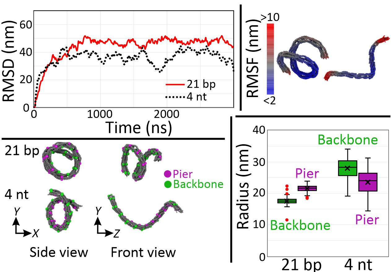 Finally, we performed coarse-grained molecular dynamics to confirm these higher order mesoscale structures of DNA nanosprings (Figure 5). To simulate a G-quadruplex structure, we used 4 nt poly-T linker (4T) given that both have similar end-to-end distances. Assuming the distance between the ends of G-quadruplex structure is about 2 to 3 nm and that between neighboring bases of single-stranded DNA is 0.68 nm, we simulated the structures as the 21 bp and the 4 nt linkers. From the plot of root mean square deviation (RMSD), we assumed that the structures were fully relaxed after 2 µs of simulation and decided to use the result of the last 1 µs for further analysis. Using 100 snapshots with 10 ns time interval of the last 1 µs, we computed the root mean square fluctuation (RMSF) and found that the structures were subject to large thermal fluctuations, indicating that the nanospring is a soft material. For the coiling arrangement, backbones appeared inside and outside for the cases of the 21 bp and 4 nt linker, respectively, which are consistent with experimental observations. In the case of the 21 bp linker, over-extended bridges push the piers apart, resulting in the inside backbones. On the other hand, tension from the short 4 nt linker pulls the piers together to make a coil with its backbone inside out. Finally, the difference in radius that the 4 nt has bigger coils than the 21 bp linker structure agreed with the experiment.