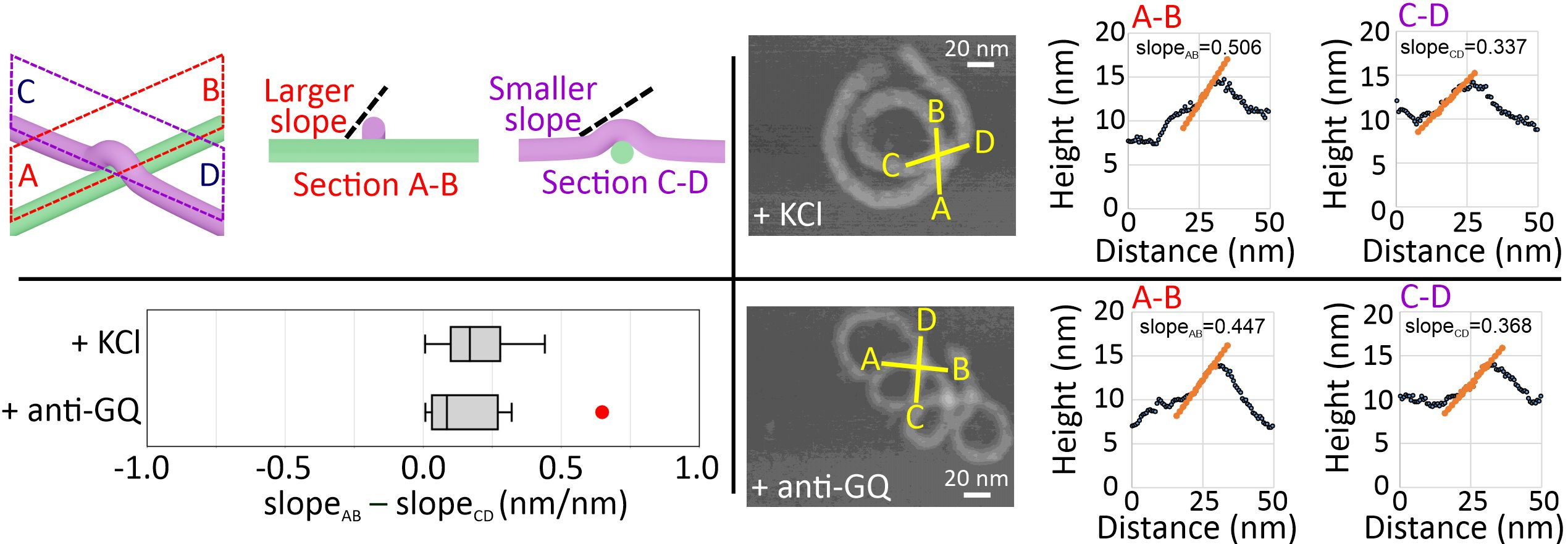 Next, we performed high-resolution AFM imaging to observe the coiling direction of the nanosprings by studying the intra-structure crossing-over points (Figure 4). Sectional profile analysis at the crossing-over point allowed us to judge which DNA bundle is lying underneath. This, in turn, enables us to distinguish the handedness of the nanospring. To determine such spatial features, we surveyed up-hill regions and compared the difference of the uphill slope values at the crossing-over point, slopeAB – slopeCD. A positive difference indicates a right-handed structure. In all our measurements, change in slopes for anti-GQ-NS and GQ-NS both showed positive values, suggesting both nanosprings are right-handed. Even though GQ-NS and anti-GQ-NS shared the right-handed helical chirality, opposite backbone orientations (i.e., backbone flipping) were observed. This suggests that an achiral backbone orientation stemmed from the linear chemo-mechanical force is not responsible for the higher order mesoscale chirality. Instead, the slightly overwinding helicity in the B-DNA based nanospring backbones may determine the nanospring chirality.