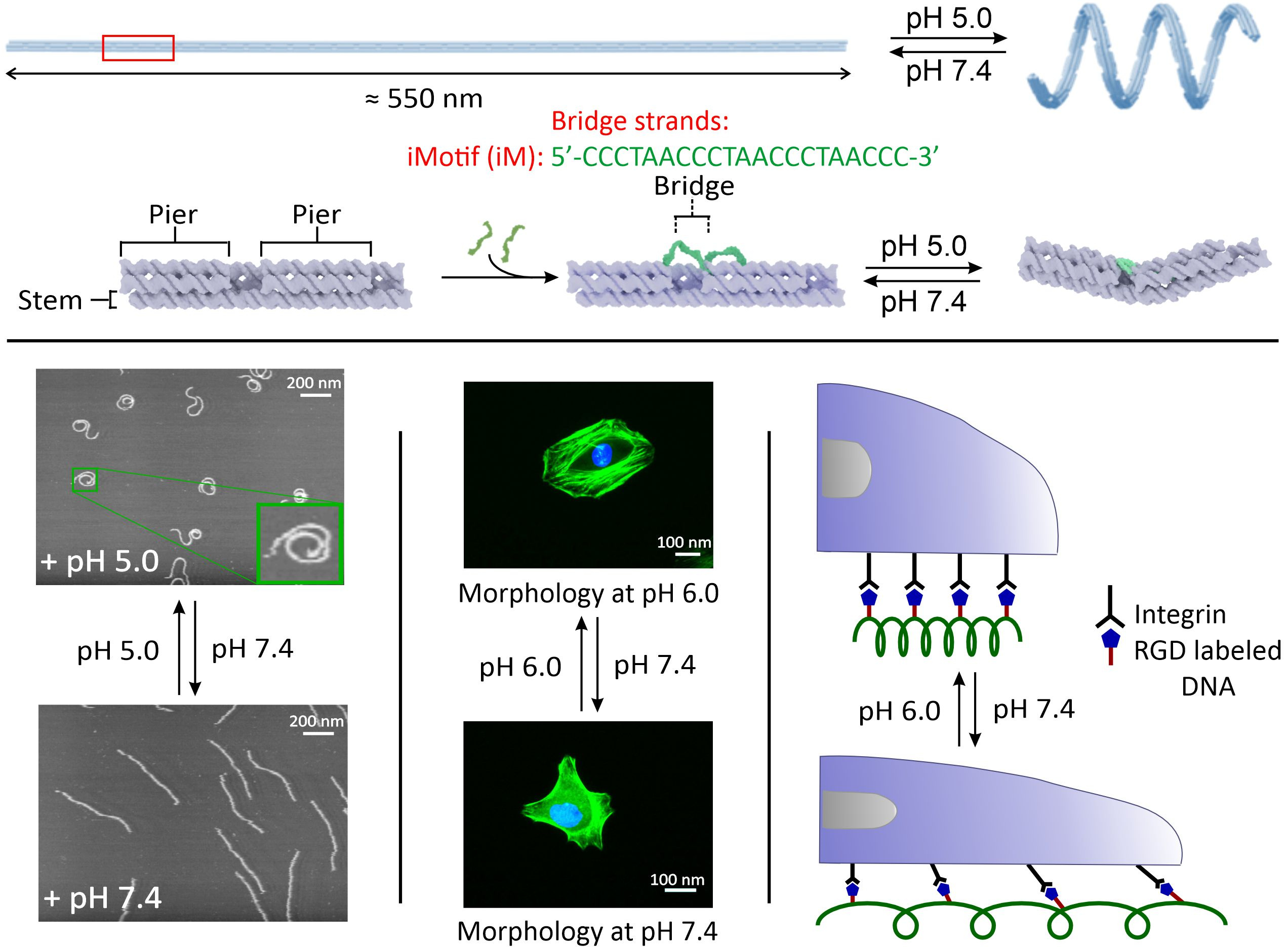 In the past two years, the research team was able to synthesize pH dependent nanospring origami by incorporating i-Motif structures in the nanospring backbone such that the origami demonstrated a linear conformation at neutral pH while a coiled form at acidic pH.1 Moreover, we modified the nanospring origami with arginyl-glycyl-aspartic acid (RGD) peptide, a ligand that binds to integrins on cell surface. This reversible conformation change was exploited to restrict the motion of cancer cells which experience acidic pH in extracellular medium (Figure 1). In addition, we also formulated a single-molecule method to characterize the mechanical properties of these nanosprings2, such as spring constant, kinetics, recoil and uncoil distances, and pitch of nanosprings.