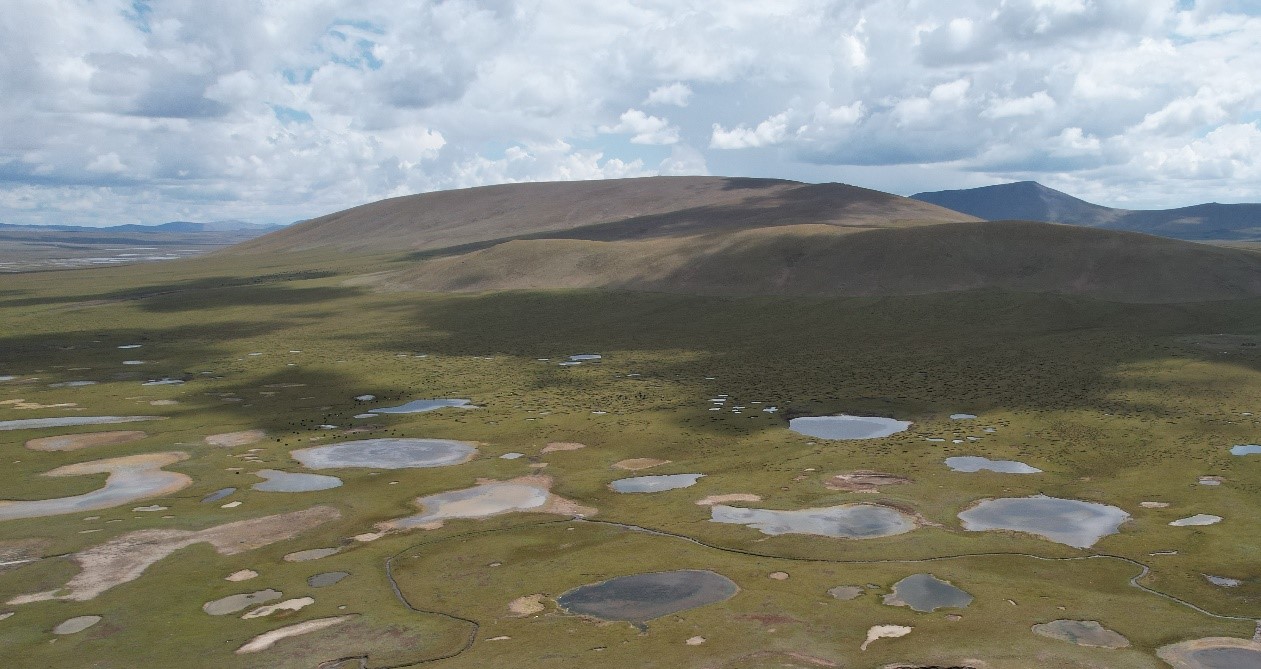 Landscape of thermokarst lakes nearby Bayankala Mountain Pass on the Tibetan Plateau (34.2 oN, 97.8 oE; altitude: 4557 m; credit: Futing Liu)