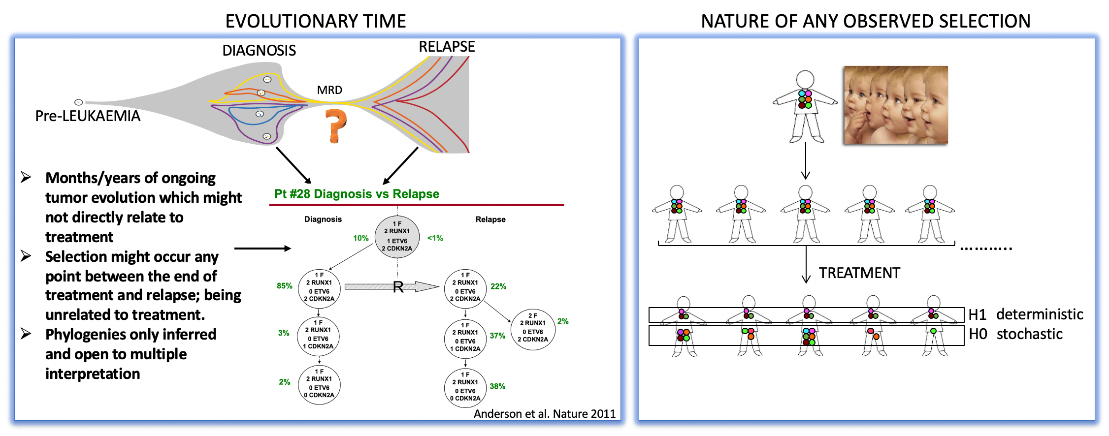 When we finally got to analyze our mouse model, to our initial surprise, we found that the immediate post-induction chemotherapy disease residuum was as genetically variegated as the untreated leukaemia. This observation suggested that chemotherapy does not deterministically select at the genotype level. After our initial disbelief, we realized that our finding resonated with the observations that many subclones in BCP-ALL share the same lesions (a phenomenon indicative of parallel evolution – and evidenced in our data) and that, to date, no single gene has been unambiguously associated with resistance to chemotherapy in BCP-ALL.