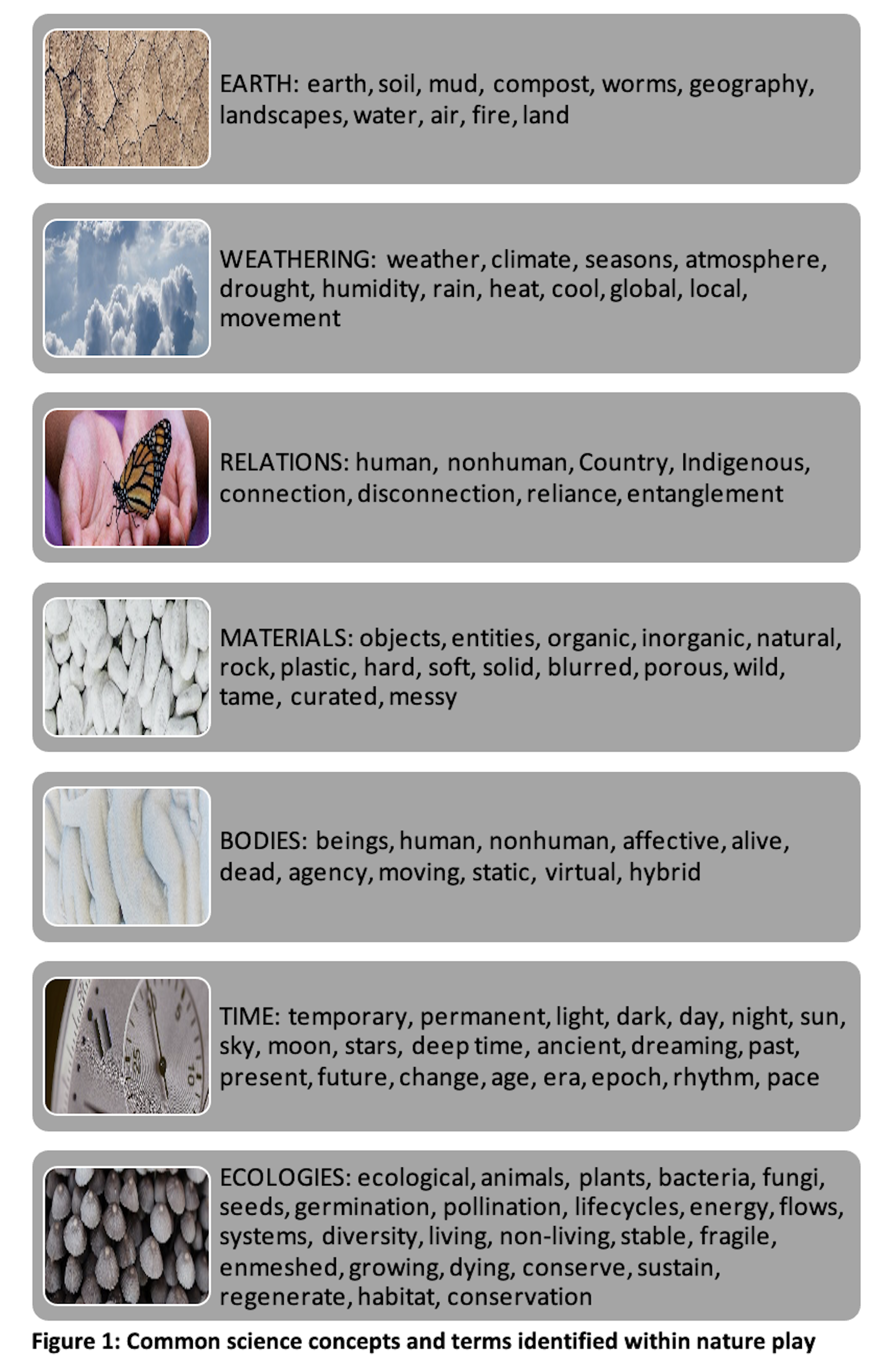 The project uncovered a vast number of key scientific concepts and terms explored through nature play. These were organised under the key areas of earth, ecologies, relations, materials, bodies, time and weathering.