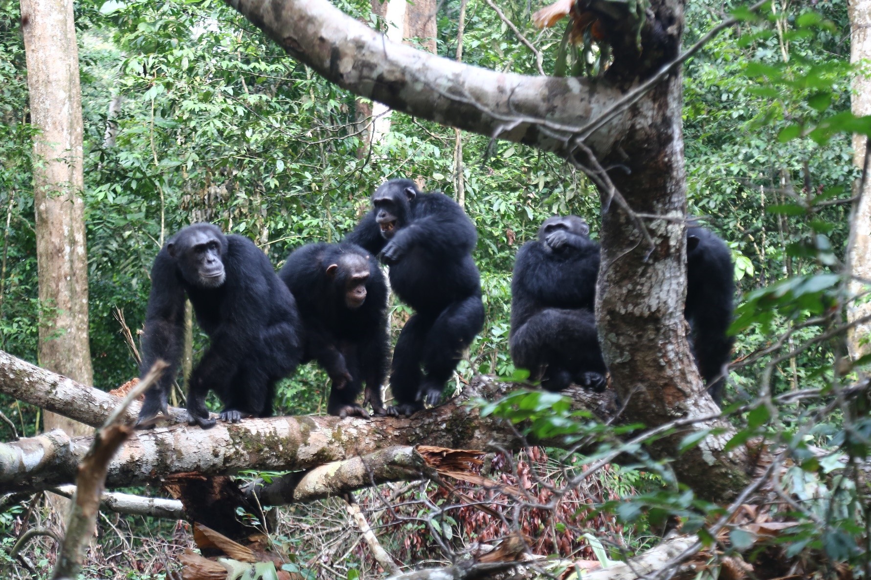 The attack on the neighbouring group had begun. The contrast between the silent approach and the hectic chaos and noise of the fight were striking. Deafening screams and barks surrounded me, and the previously peaceful forest instantly turned into a battlefield. Willy and Fredy were charging towards the rival group, shoulder to shoulder, scattering the out-group chimpanzees as they ran. Poseidon and Richelieu jointly chased the same chimpanzees from another direction, and Indira and Pola drummed on tree buttresses and then assisted in the chase, all while carrying their infants on their backs. Teamwork is a key component here to win the conflict, and the coordinated response of the chimpanzees meant that no injuries were suffered this time.