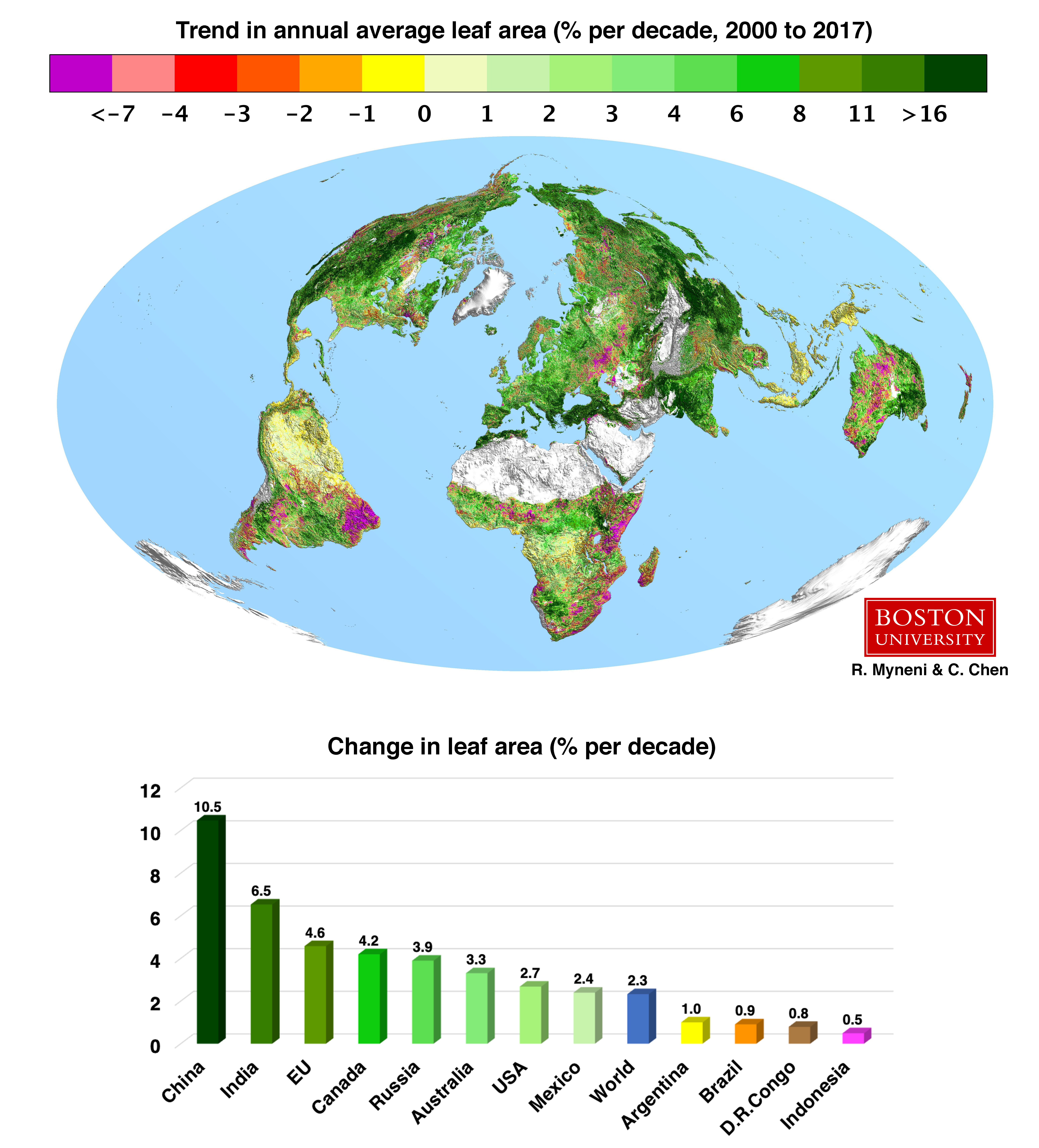 The greening over the last two decades represents an increase in leaf area on plants and trees equivalent to the areal span of the entire Amazonian rainforests. Green leaves produce sugars using energy in the sunlight to mix CO2 drawn in from the air with water and nutrients pumped in from the ground. These sugars are the source of food, fiber and fuel for life on Earth. China and India account for one-third of the greening but contain only 9% of the global vegetated land area, a surprising finding considering the general notion of land degradation in populous countries from over-exploitation.