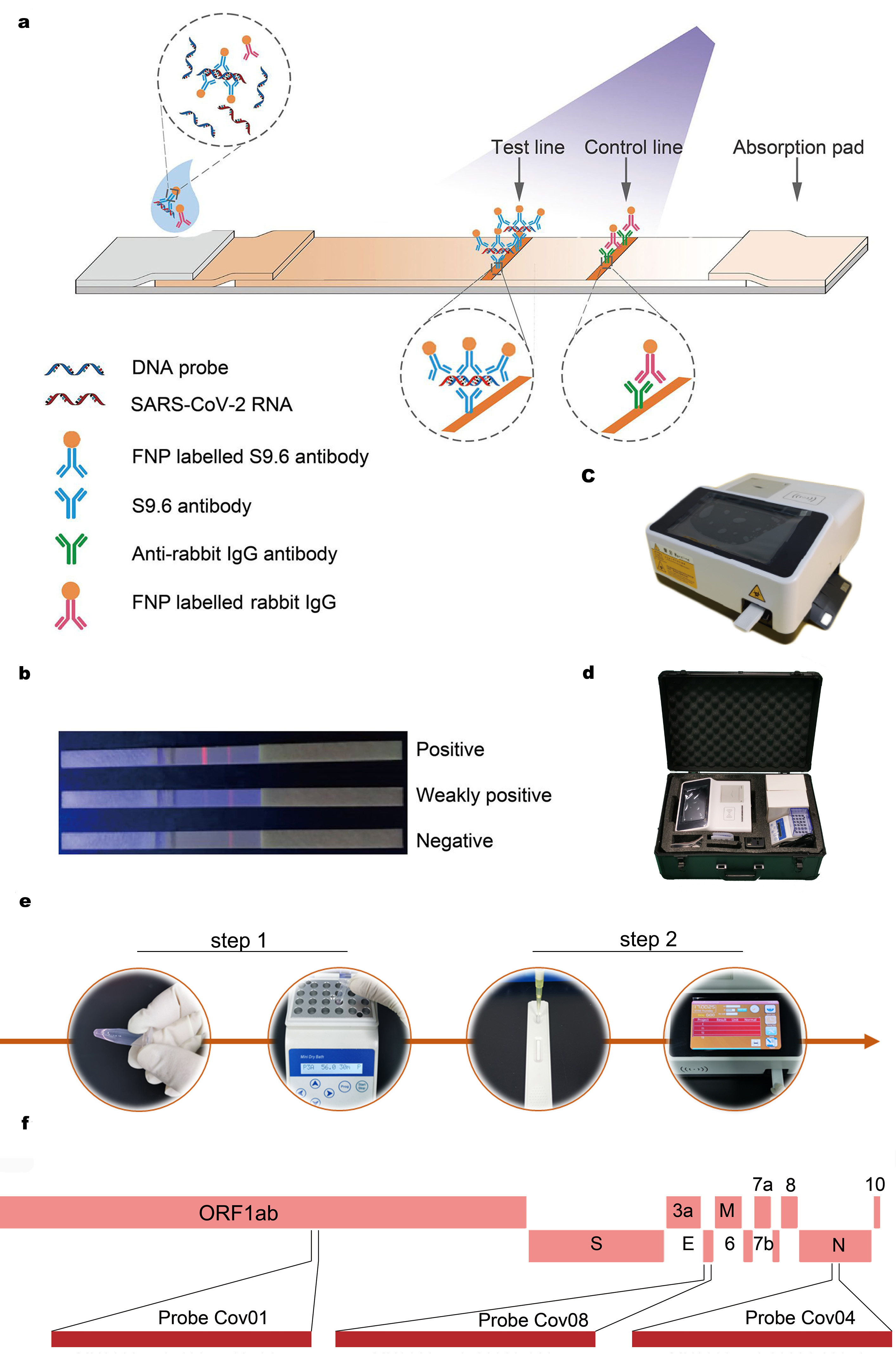 The whole test procedure involved two steps, namely hybridization and immunofluorescence analysis, and can be finished in less than an hour. Optimized DNA probes targeting the conserved open reading frame 1ab (ORF1ab), envelope protein (E) and the nucleocapsid (N) regions of the SARS-CoV-2 genome were documented to have limit of detection (LOD) of 500 copies/mL for clinical throat swab samples, comparable to the commercial kits based on RT-qPCR. And no significant cross-reaction was found between the SARS-CoV-2 probes and 55 common pathogens. The HC-FIA assay is also documented to be robust to interference such as hemoglobin, mucin and various possible drugs that might exist in clinical samples. The assay and test kit could be adapted for the detection of other viral RNA.