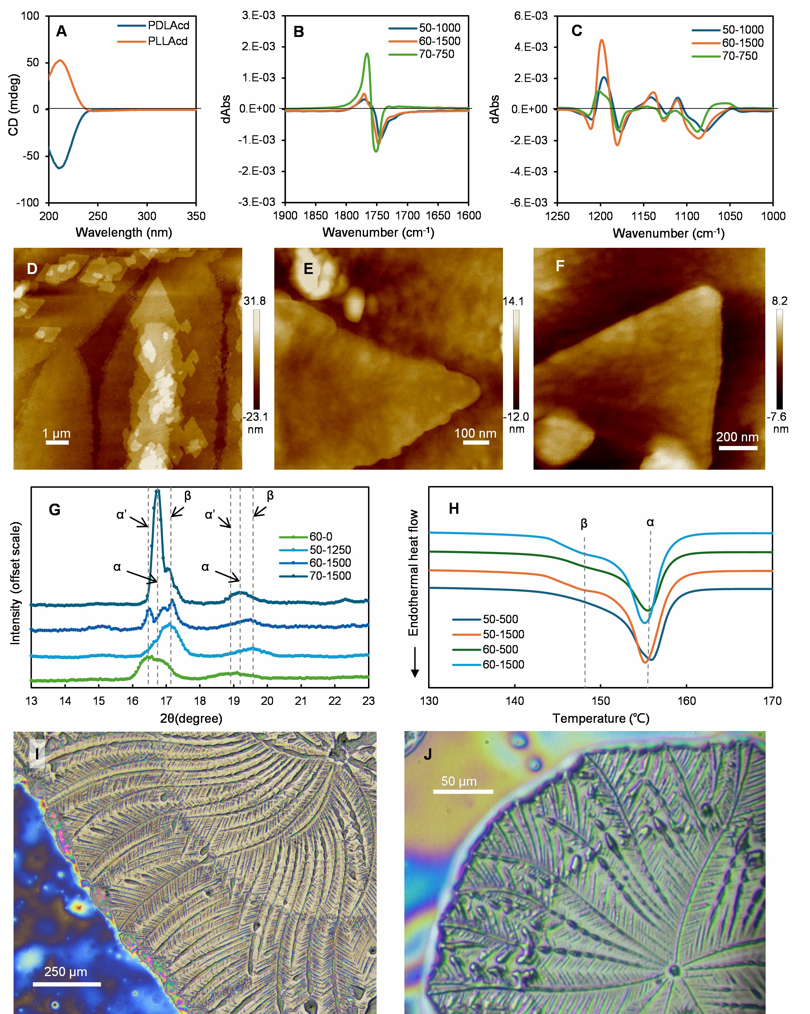 Fig. 2 Chirality information at different levels, A ECD spectra of PDLA and PLLA in Acetonitrile (AcCN) solution, PDLAcd means the CD signal of PDLA solution, the unit mdeg means millidegree which equals to 0.001 degree. B and C VCD spectra of crystalline PLLA solid sample, the sample number represents the crystallization conditions, for example, 50-1000 means a crystallization temperature of 50 ℃ and a CO2 pressure of 1000 Psi. The Y-axis of B and C means the difference in absorption of left-handed and right-handed polarized light by samples. D AFM height image of left-handed spiral crystals (Tc = 50℃, Pc = 1250 Psi). E AFM height image of right-handed spiral crystal (Tc = 70℃, Pc = 1000 Psi). F AFM height image of non-spiral crystal (Tc = 60℃, Pc = 1500 Psi). G One-dimensional (1D) GIWAXS data. H One-heating Differential Scanning Calorimetry (DSC) data of PLLA samples crystallized in high-pressure CO2. I Simultaneously changing the temperature from 50 to 70°C and adjusting the CO2 pressure from 1300 to 1000 Psi induces a change in the spiral chirality of PDLA crystals. J Changing the CO2 pressure from 1250 to 750 Psi at 60°C induces a reversal in the spiral chirality of PDLA crystals.