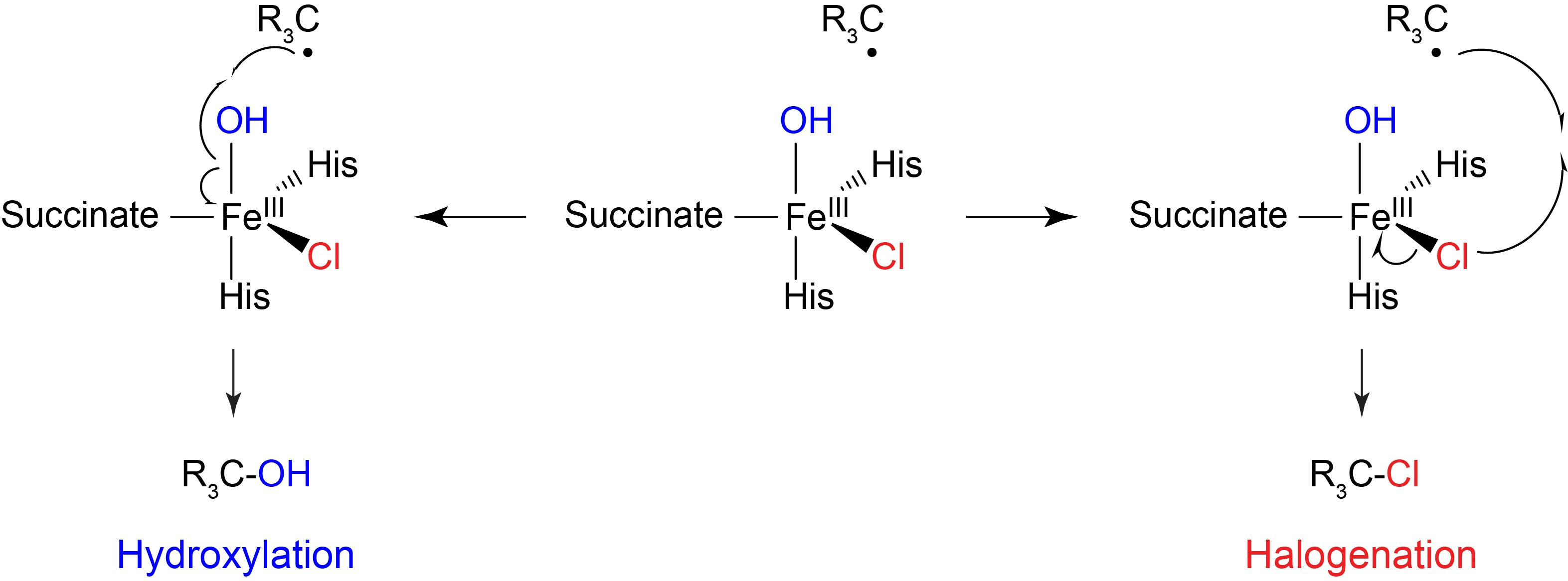 Since BesD has a much simpler substrate than the other known families of radical halogenases, it may be a particularly tractable system for studying the mechanism of how enzymes can perform selective halogenation. The FeII/aKG-dependent halogenases actually face multiple challenges with regard to selectivity. Beyond the typical problems of substrate selectivity and regioselectivity, halogenases also need to solve the problem of how to achieve reaction pathway selectivity. They use a reactive FeIV-oxo species to generate a substrate radical, yielding an intermediate with two possible reaction outcomes (Figure 2). If rebound with the halogen occurs, then the desired halogenated product is produced. However, rebound of the resulting hydroxyl radical can also occur to yield the hydroxylated product. We solved the lysine-bound crystal structure of BesD and performed structure-guided mutagenesis to better understand how the enzyme selectively achieves halogenation instead of hydroxylation. Our results suggest that critical factors for halogenation selectivity include residues that control the precise positioning of lysine in the active site as well as second-sphere residues that may direct the ligand geometry of the Fe-complex.