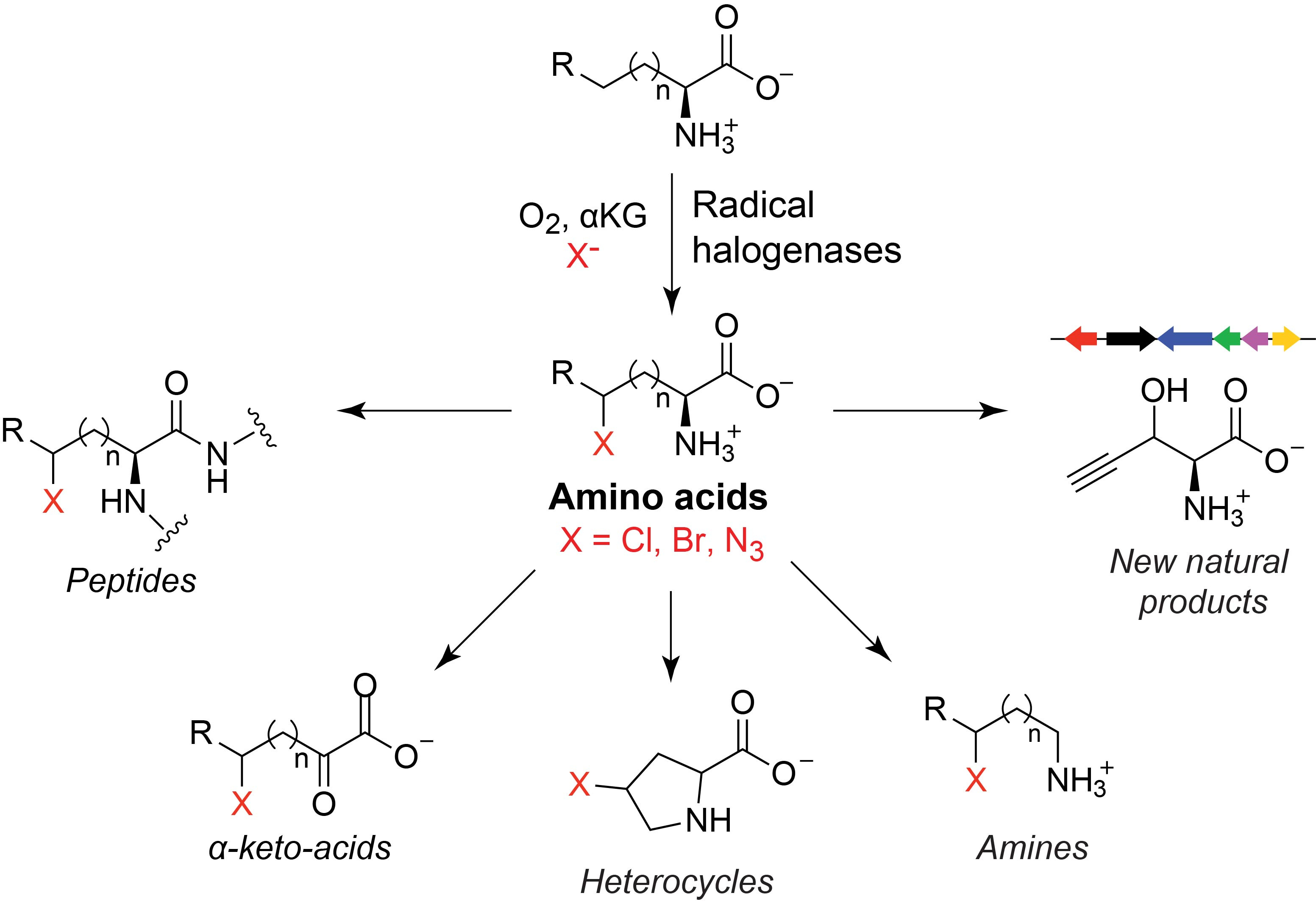 Amino acids are key components of cellular metabolism, serving as the precursors to many metabolites, natural products, and ribosomally and non-ribosomally synthesized peptides and proteins (Figure 1). Therefore, the ability to install useful functional groups onto amino acids in vivo would enable the production of a broad range of new molecules. Our group recently discovered the FeII/alpha-ketoglutarate (FeII/aKG)-dependent radical halogenase BesD as part of a pathway to produce a terminal alkyne-containing amino acid.1 BesD modifies the amino acid lysine by installing a halogen on an unactivated sp3 carbon, which is a challenging reaction to achieve selectively using traditional synthetic strategies. Although radical halogenases were discovered close to 15 years ago, only two families have been identified to date.2,3 Part of the challenge is that radical halogenases seem to have evolved separately within different families and thus share very low sequence homology. In this study, we have solved the crystal structure of BesD to gain insight into its mechanism and used bioinformatics to discover additional members of this novel family of halogenases. The newly discovered halogenases are regioselective, can modify a range of amino acids, and are capable of installing the synthetically useful functional groups -Br and -N3 in addition to -Cl. Finally, we demonstrated that non-canonical amino acids produced by BesD halogenases can be funneled into enzyme cascades to generate chlorinated heterocycles, diamines, keto-acids, and peptides in vitro.