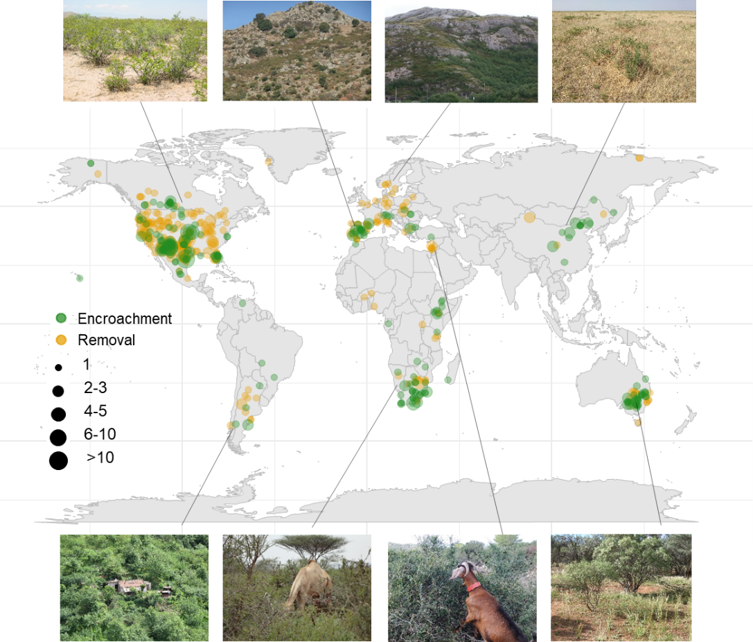 The global distribution of 216 woody encroachment studies and 308 woody removal studies across the globe, with selected photos showing the encroached landscape.