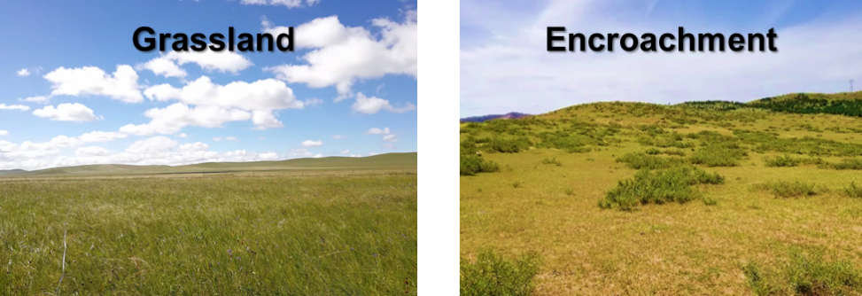 Unencroached grassland (left) and encroached grasslands (right) in Inner Mongolia, China. In the encroached landscape, woody plants form patches, and grasses are sparser in the interspaces. Photos were credited to Jingyi Ding.