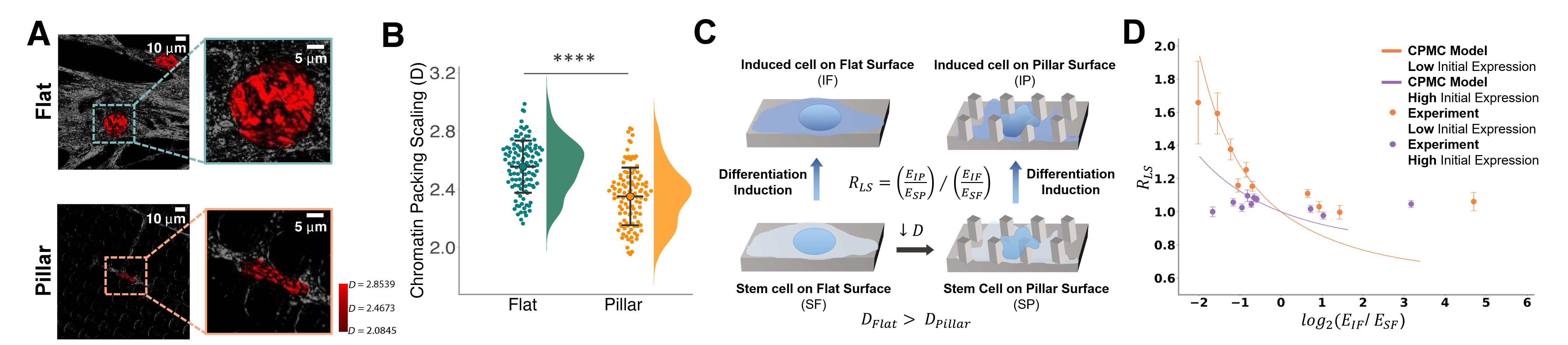 Based on our previous study1, we reveled that chromatin packing scaling (D) is a key physical property that is associated with transcription regulation and is also a crucial regulator of phenotypic plasticity. Using partial-wave spectroscopic (PWS) microscopy, we are able to measuring D with sensitivity to length scales as small as 20 nm in living hMSCs (Fig. 2). It showed a dramatic decrease of D on micropillars compared to flat surfaces indicating a drastic change in chromatin conformation. To understand how chromatin conformation affect cell phenotype, we performed RNA-sequencing and ATAC-sequencing in hMSCs that were cultured on flat and micropillar surfaces with growth and osteogenic induction medium, respectively. It revealed that the changes in gene expression on micropillars are associated with alterations in chromatin accessibility. Specifically, we found upregulation in the expression of genes involved in response to external stimulus. Thus, we evaluated the lineage-specific responsiveness coefficient, RLS, defined as the average transcriptional response to an external differentiation stimulus of stem cells on a micropillar surface compared to a flat surface. Based on our chromatin packing macromolecular crowding (CPMC) model1, we reveled that the lineage-specific transcriptional response to osteogenic differentiation induction increased in low D cells on micropillars compared to high D cells cultured on flat surfaces indicating enhanced transcriptional compliance. It was further confirmed with in vitro osteogenic differentiation of hMSCs. Cells with deformed nuclei showed enhanced osteogenic differentiation upon induction.