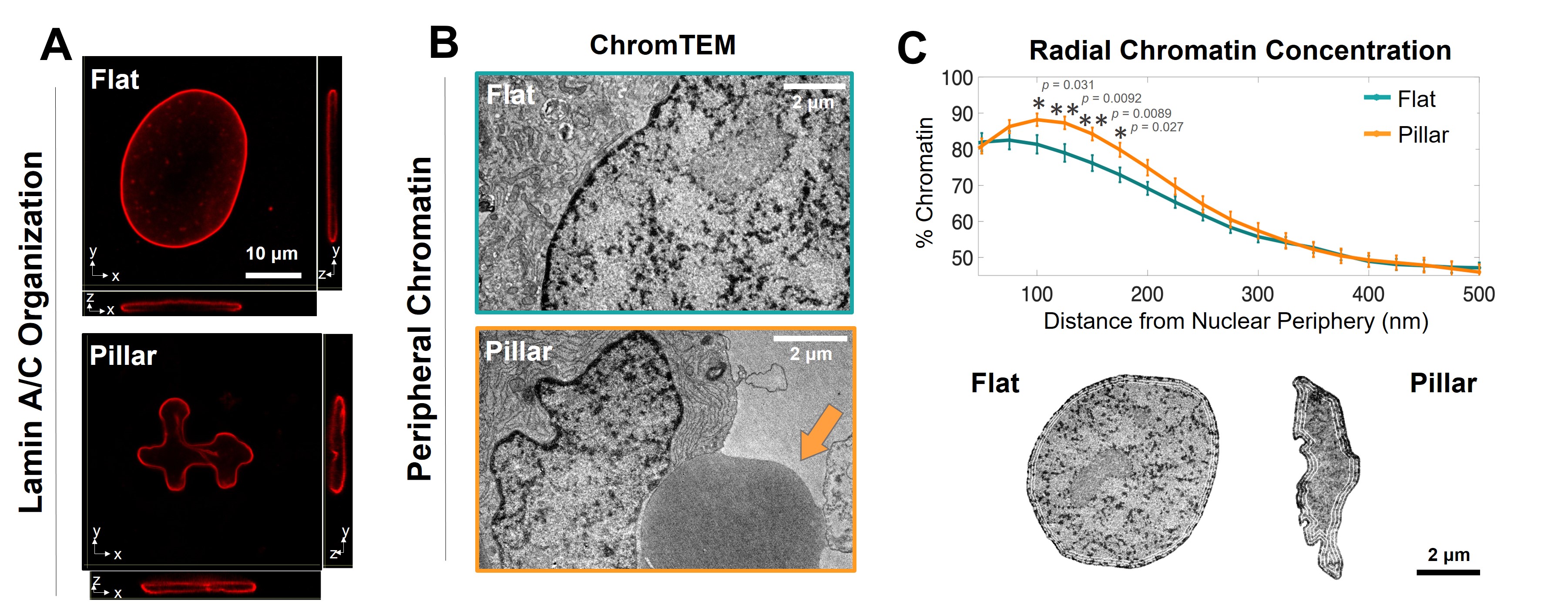Figure 1. Micropillar-induced nuclear deformation is associated with alterations in nuclear structural components. A. Lamin A/C staining images of hMSC nuclei on flat and micropillar surfaces. B. ChromTEM images of 50 nm thick resin sections of hMSCs seeded on flat and micropillar surfaces. The orange arrow shows the location of micropillars. C. Top: Radial Chromatin concentration analysis defined by the percentage of chromatin within consecutive 25 nm thick bands as a function of the distance from its location to the nuclear periphery. Bottom: ChromTEM images show radial bands at 25 nm, 250 nm, 500 nm, and 750 nm.