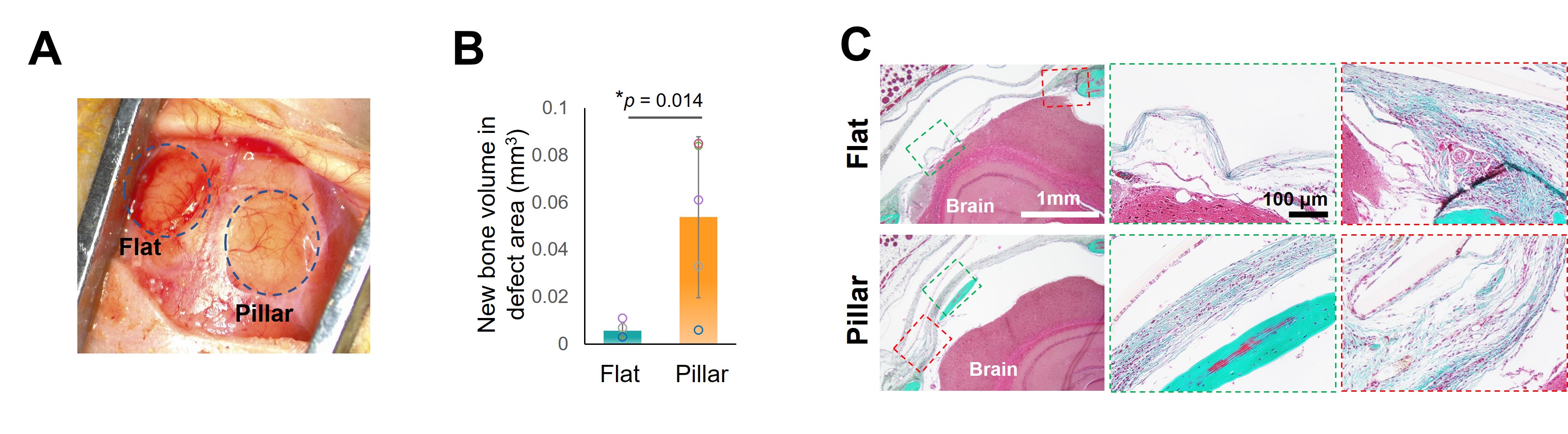 Figure 3. Micropillar-induced nuclear deformation promotes bone regeneration in vivo. A. Two critical-sized cranial defects with a diameter of 4 mm were created, followed by implantation of hMSC-seeded flat and micropillar mPOC scaffolds. B. Newly formed bone volume in the defect region treated with flat and micropillar implants. C. Trichrome staining of calvarial defect tissue treated with flat and micropillar implants.
