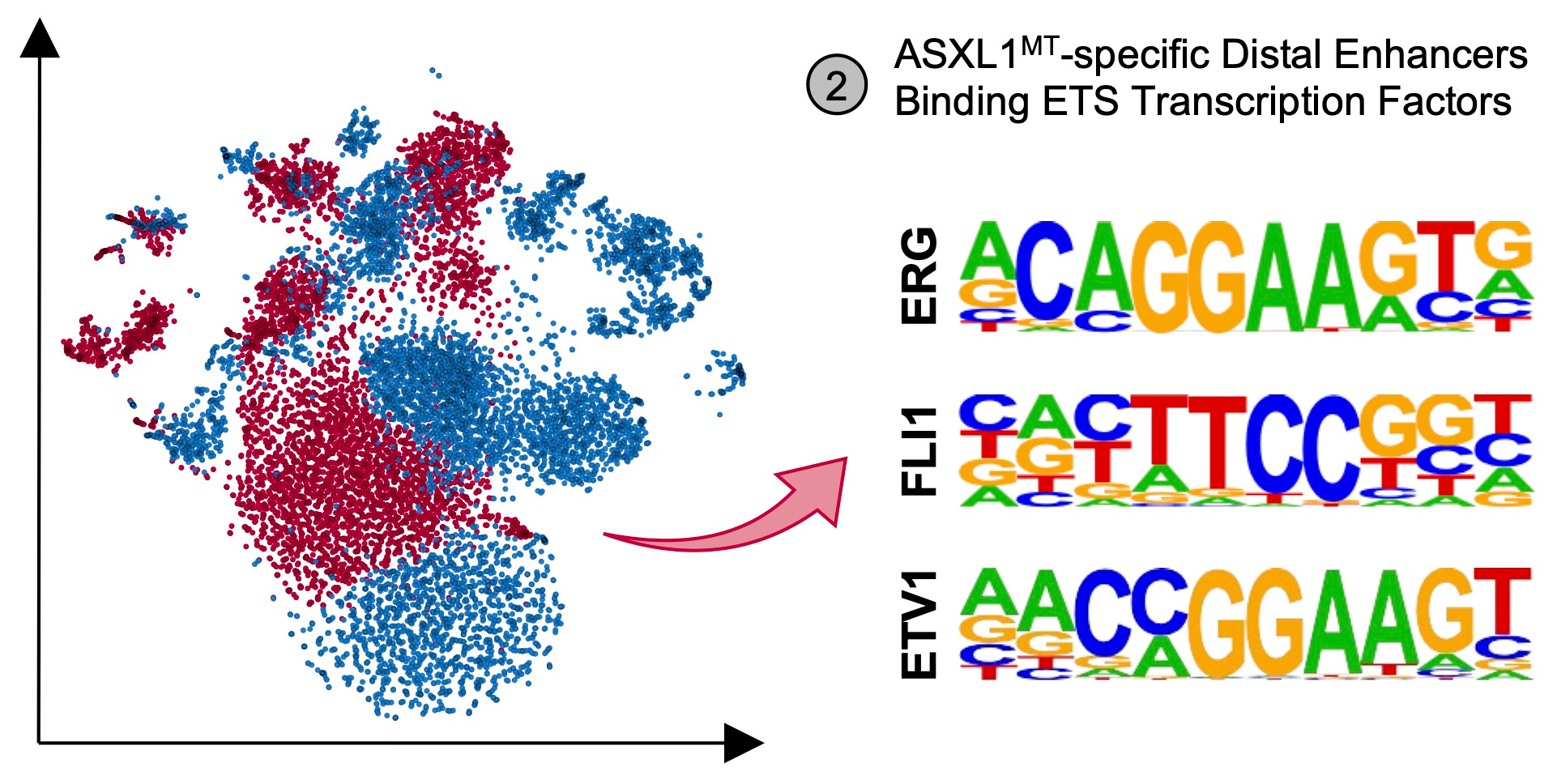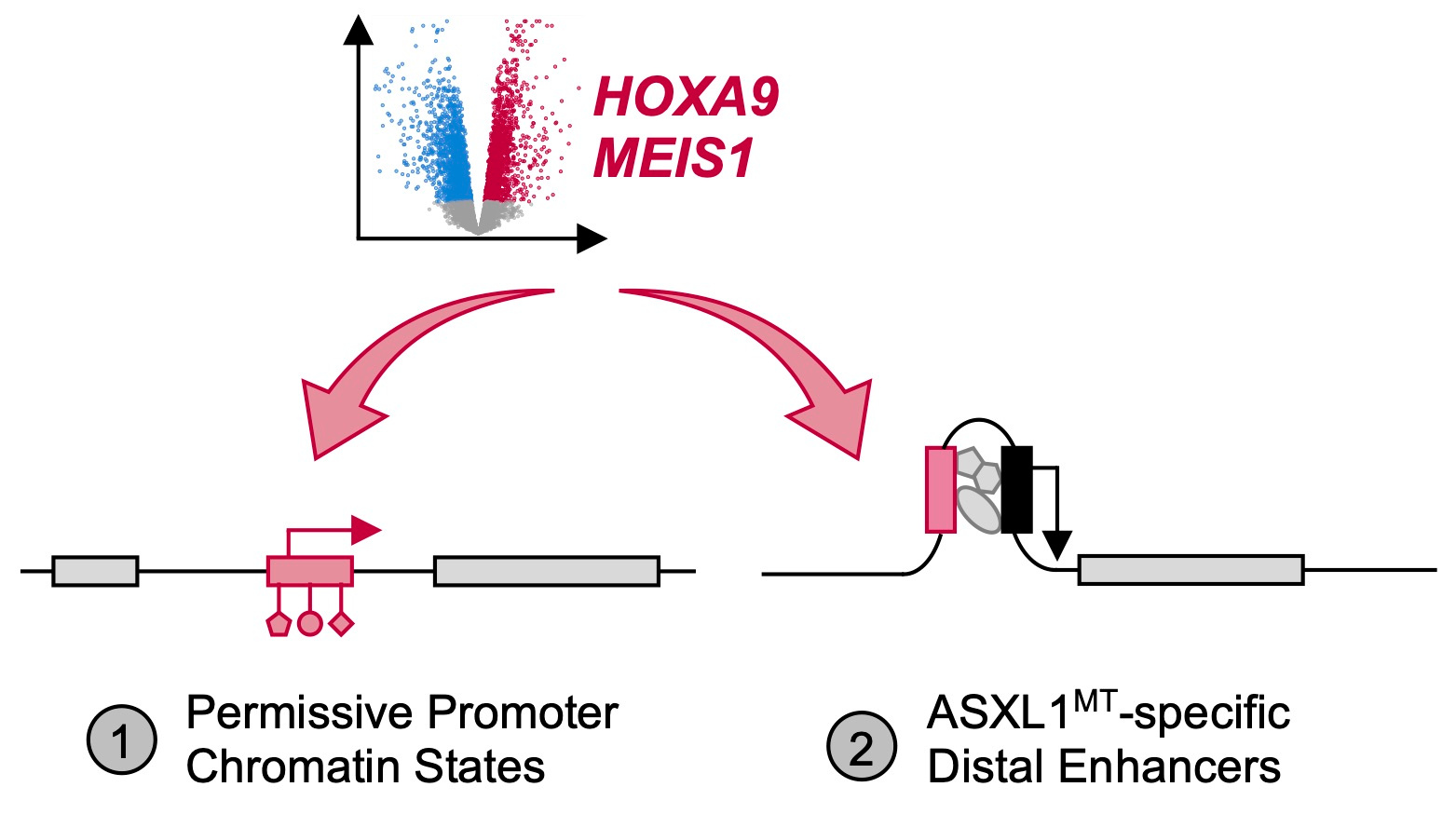 Overall, this study supports the notion that genotype-specific distal enhancers have a specific repertoire of transcription factors binding to them, strongly associate with the overexpression of important leukemogenic driver genes in their proximity, and may be attractive therapeutic targets for novel epigenetic small molecule drugs. These ASXL1-mutant-specific distal enhancers and their interacting transcription factors may represent sufficiently lineage- and genotype-specific therapeutic targets to allow the development of safe and effective individualized therapies for patients with ASXL1-mutant CMML.