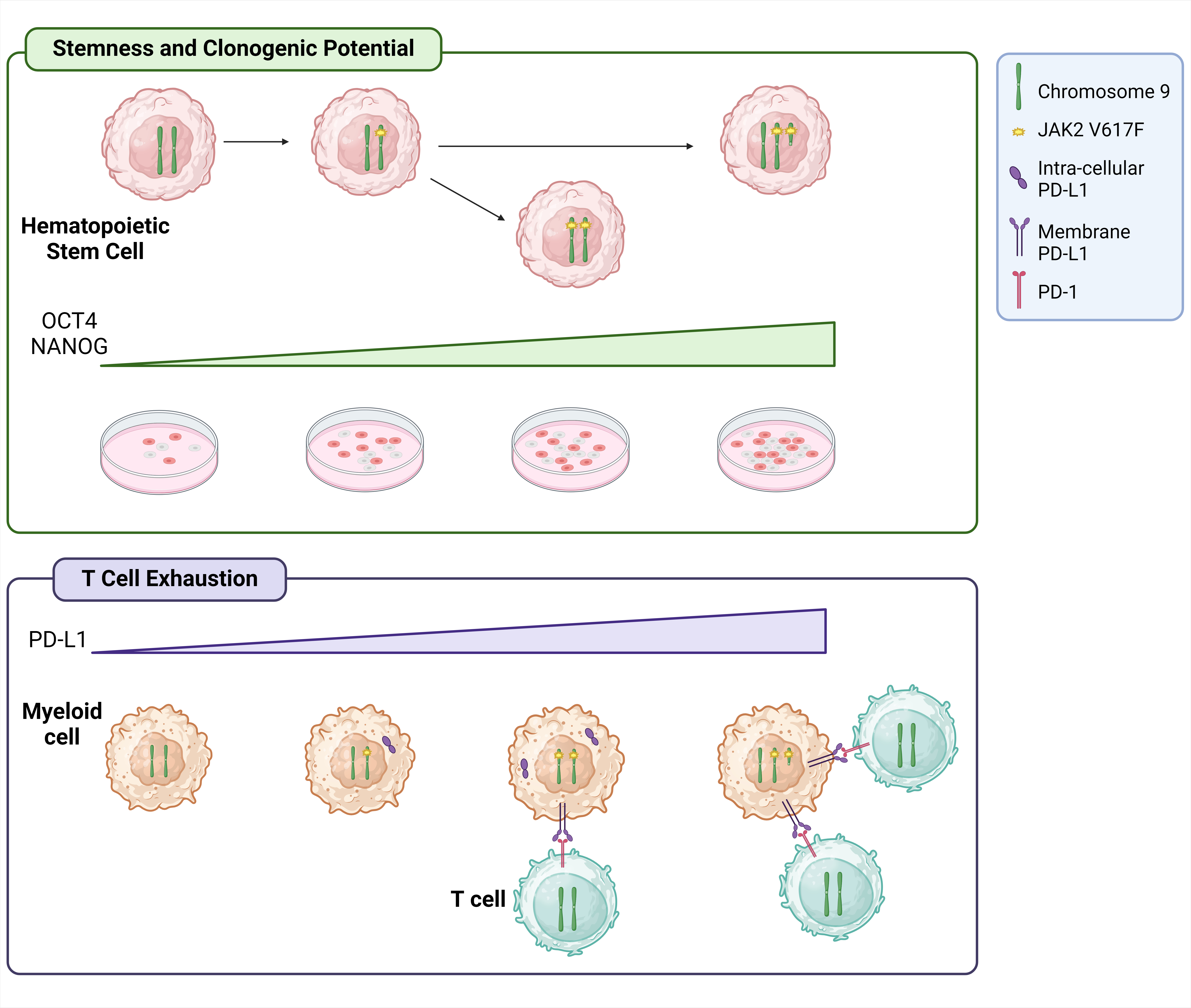 Overall, this work enabled us to identify and characterize a novel subgroup of MPN patients carrying both the JAK2 driver mutation and chromosome 9p amplification (Figure 1). Our findings demonstrate that in this condition 9p duplication is linked to the increased activation of PD-1/PD-L1 axis, leading to immune escape due to an exhausted T cell phenotype. Additionally, CD34+ cells from these patients exhibit a greater clonogenic potential and a more primitive phenotype compared to diploid JAK2-mutated MPN patients, likely resulting from the upregulation of OCT4 and NANOG through AKT signaling mediated by PD-L1 overexpression. As a whole, this work underscores the importance of an in-depth molecular characterization of oncologic patients. This personalized approach will lead to the identification of pathogenic mechanisms that can be targeted by novel and tailored therapeutic approaches.