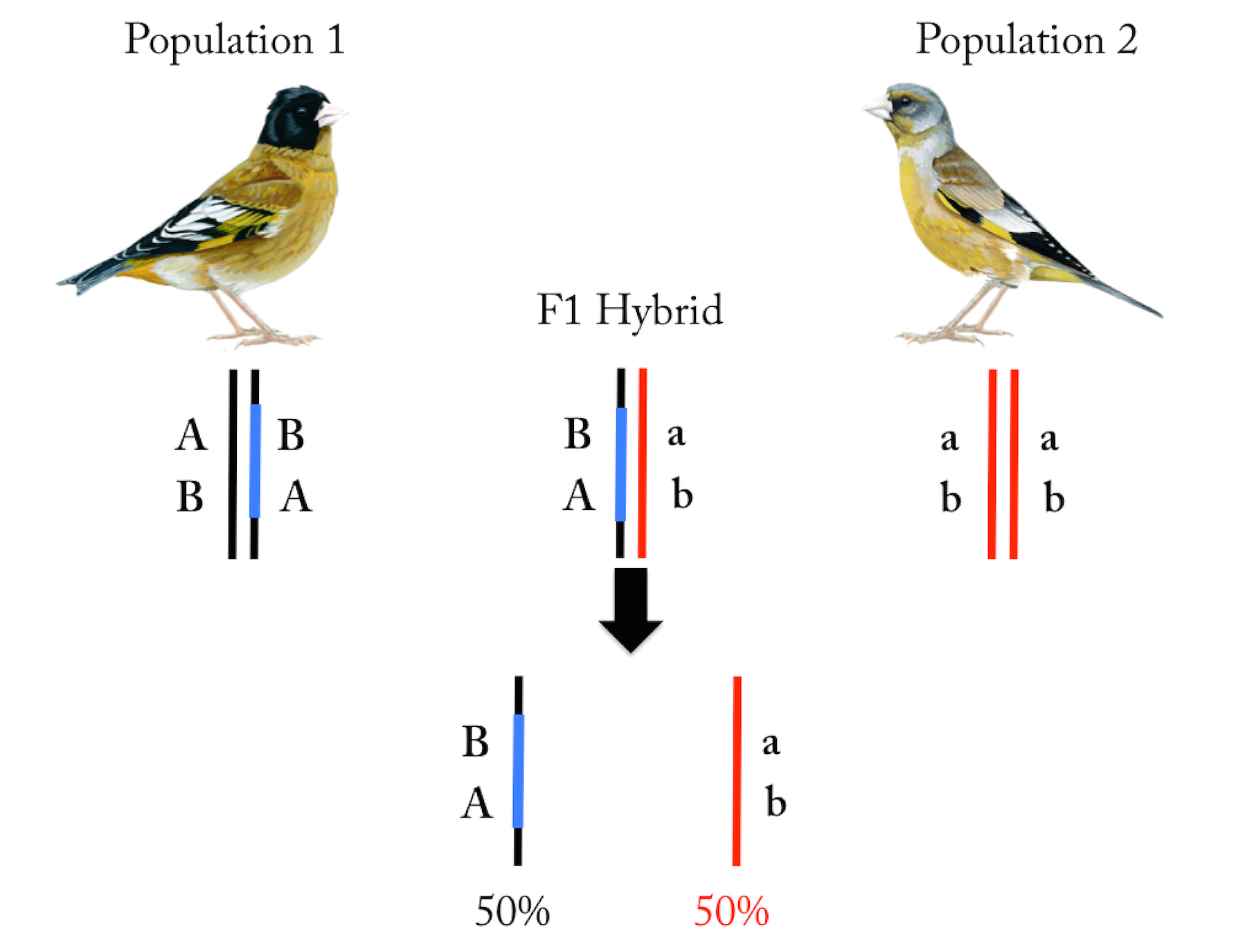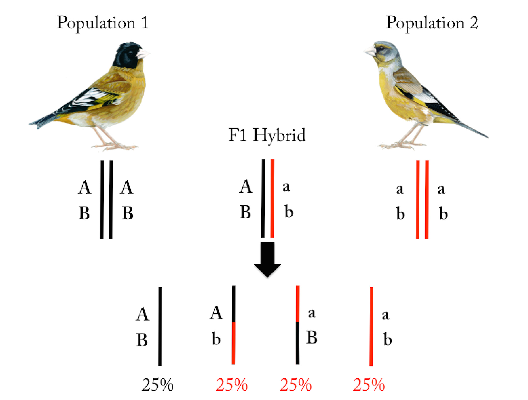 Consider two populations that are divergently adapted at two genetic loci: A and B. In population 1, alleles 'A' and 'B' are favoured whereas in population 2, alleles 'a' and 'b' are favoured. In hybrid crosses between individuals of these two populations, free recombination during meiosis breaks up the locally favoured allelic combination and results in locally-favoured gametes only 25% of the time.