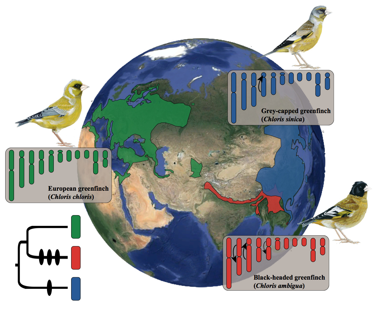 Inversion fixation history between greenfinches in the genus Chloris highlighting how range overlap is often associated with inversion differentiation. The geographic breeding ranges of the European greenfinch, Grey-capped greenfinch, and Black-headed greenfinch are shown in green, blue, and red, respectively. Chromosome structure, approximating size and centromere placement, for the nine largest autosomes, Z, and W chromosomes are shown for each species with inversions that have fixed within each lineage represented by curved arrows. The phylogenetic relationships of the three species is shown in the lower right, with inversions that have fixed represented as ovals on the branch in which they are inferred to have occurred.