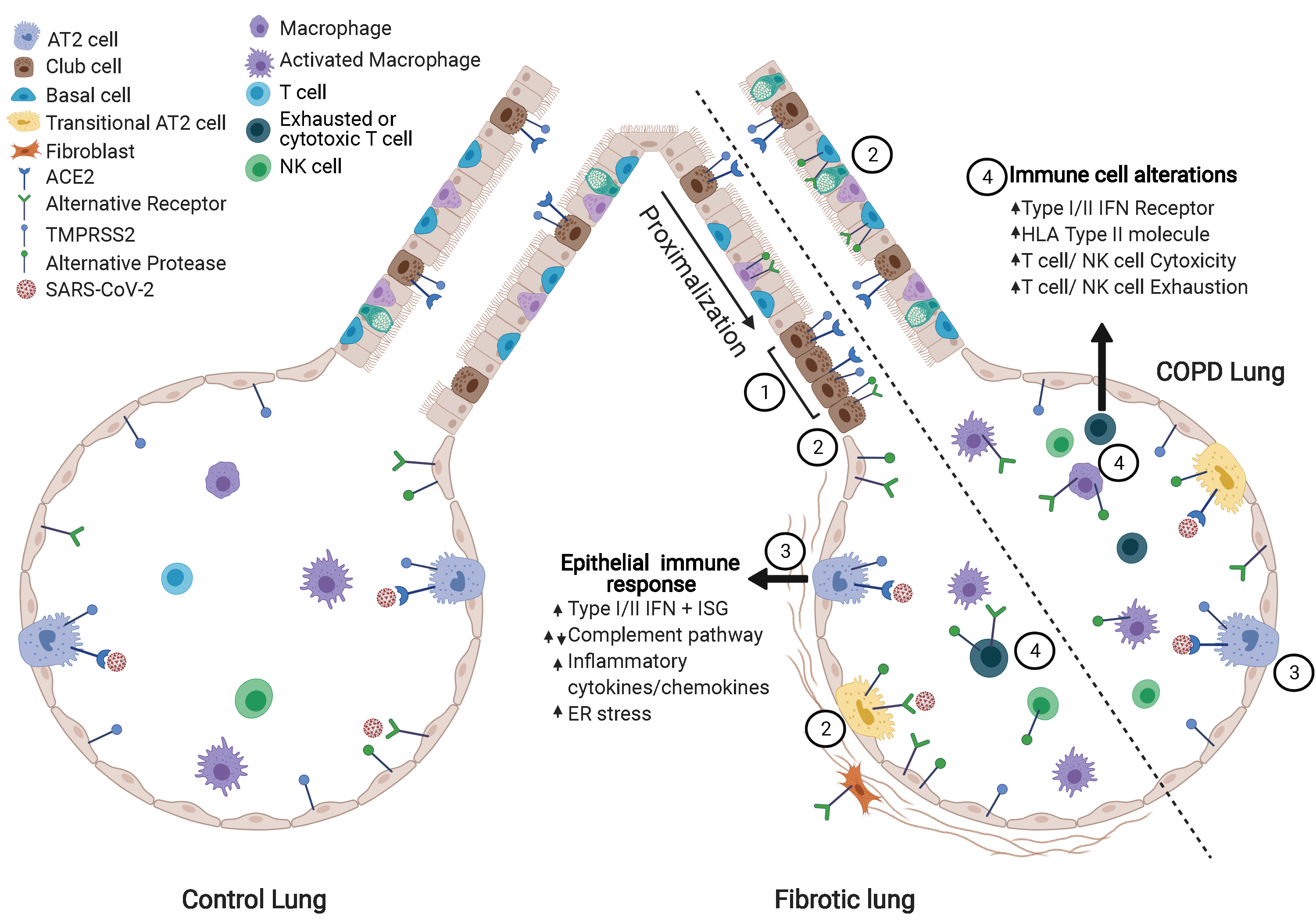 In March 2020, our labs, along with most across the world, were largely shut down due to the COVID-19 pandemic. As scientists and physicians, we wanted to contribute to the urgent efforts to understand more about COVID-19, and the virus that caused it, SARS-CoV-2. Initial reports early in the pandemic raised concern that patients with pre-existing lung disease often had severe disease and poor outcomes after coming down with COVID-19. While none of us were virologists, we had considerable experience deeply interrogating genomic and molecular mechanisms that regulate lung homeostasis and disease, and how these programs changed in disease. Through ongoing studies in our group, we had assembled a large single cell RNA sequencing dataset derived from tissue that came from patients who had advanced lung disease and others with healthy lungs. We quickly recognized that we had a unique opportunity to glean clues to why our patients with chronic lung disease (CLD) were doing so poorly after infection with SARS-CoV-2.