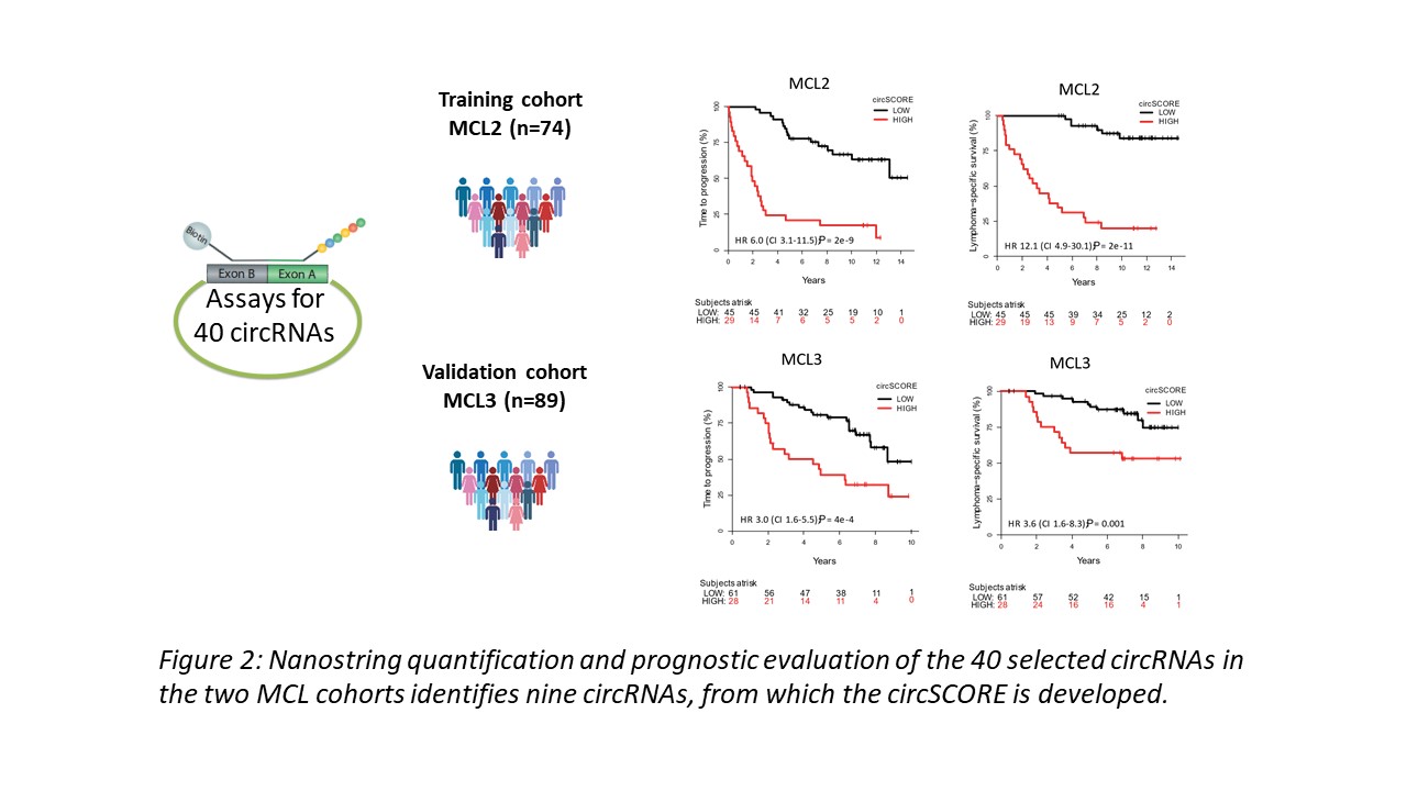 Nine circRNAs were identified as predictive in the LASSO model, and from these, we calculated a risk score (circSCORE) for each patient in MCL2 and MCL3 and stratified patients into two groups. We show that circSCORE is highly predictive of outcome in MCL, as patients with a high circSCORE have significantly inferior TTP and lymphoma-specific-survival (LSS) compared to patients with a low circSCORE.