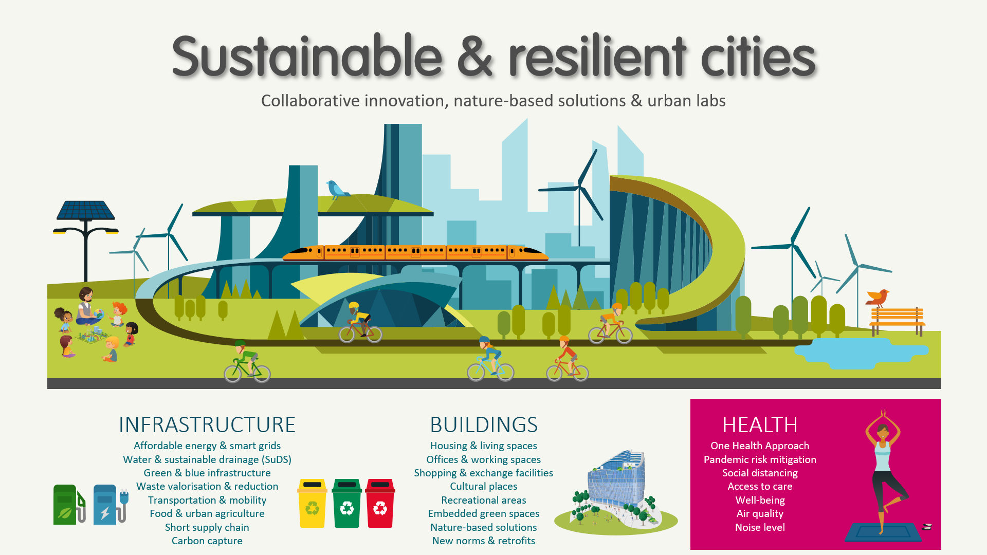 With the current health crisis, businesses’ digital transformations have been accelerated to accommodate working from home, reducing the carbon footprint. This is an opportunity to rethink working habits and environments to bring colleagues and collaborators together safely and sustainably. Inclusive and collaborative communities are more resilient. By using a “backcasting” planning method, which envisages a compelling vision of the future and then works back to work out how to achieve it, many “urban labs” are springing up, leading to innovation in construction, transport, energy, water and waste management. Many social schemes and initiatives are also being tested in real time and in real places, like fair sharing economies, which seem to be thriving.