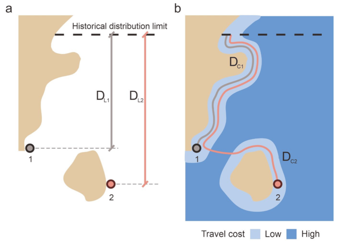 Fig. 2. Schematic showing the differences between the two metrics used for estimating maximum annual out-of-range extension distances: (a) latitudinal distances (DL) calculated as differences in latitude between an observation and the historical southern latitude for the corresponding species, and (b) along-the-coast distances (DC) calculated as least-cost-path distances constrained to the coastline between the historical southern limit and the observation.